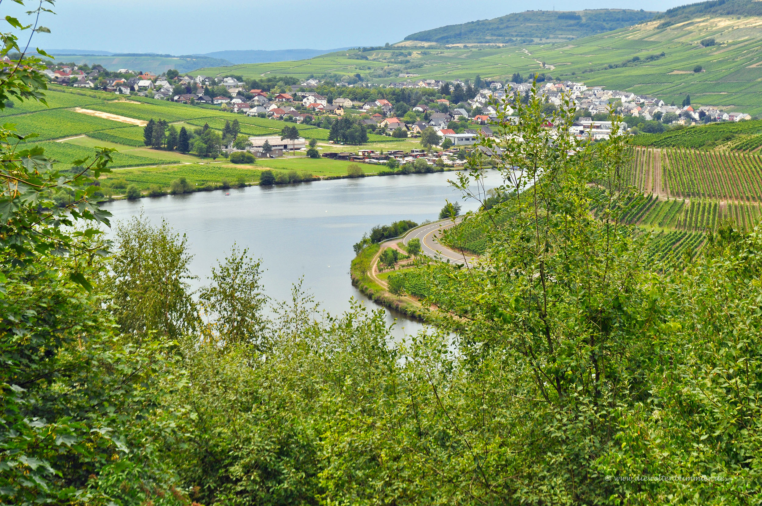 Hinter dem Campingplatz wandern wir mit Blick auf die Mosel über eine Kreuzung hinweg. Wir genießen den Anblick der Trauben, die an ungezählten Rebstöcken reifen. Außerdem beobachten wir die Arbeit der Winzer und erreichen an einer Sitzbank einen Pflaumenbaum, der seine leckeren Früchte herunter hält. Direkt hinter dem Baum biegen wir rechts ab und wandern auf dem asphaltierten Weg leicht bergauf. Sitzbänke, von denen man bereits eine schöne Aussicht auf das Moseltal hat, laden uns zu Pausen ein. Doch wir wandern auf dem kurvigen Weg weiter bergauf, bis wir das 1985 erbaute und 2003 renovierte Wassertretbecken erreichen (GPS: 49.785504, 6.842786). Flugs die Wanderstiefel ausgezogen und die Hose umgekrempelt, steigen wir durch das Wasser und regen unseren Kreislauf an.