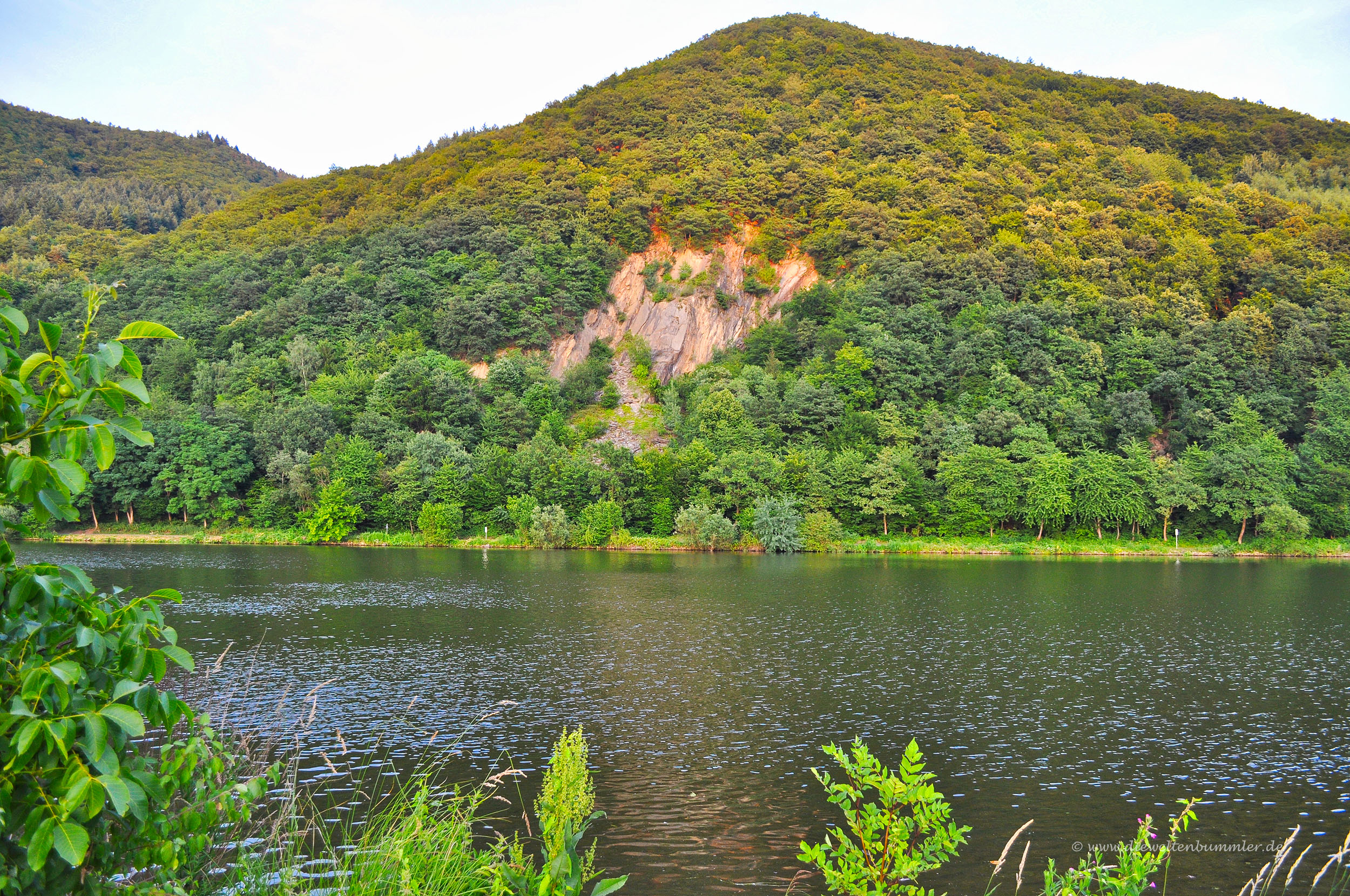 Doch unser Weg führt immer noch als schmaler Pfad weiter durch den ehemaligen Steinbruch, wo loses Gestein von Farnen überdeckt wird und die dünnen Bäume den Blick auf die Mosel freimachen (GPS: 49.790695, 6.853038). Mitten in der Steilwand stehen wir nun und genießen den Ausblick auf den Yachthafen und Campingplatz von Pölich am anderen Ufer des Flusses, wo sich ein Weinberg nur sanft erhebt.