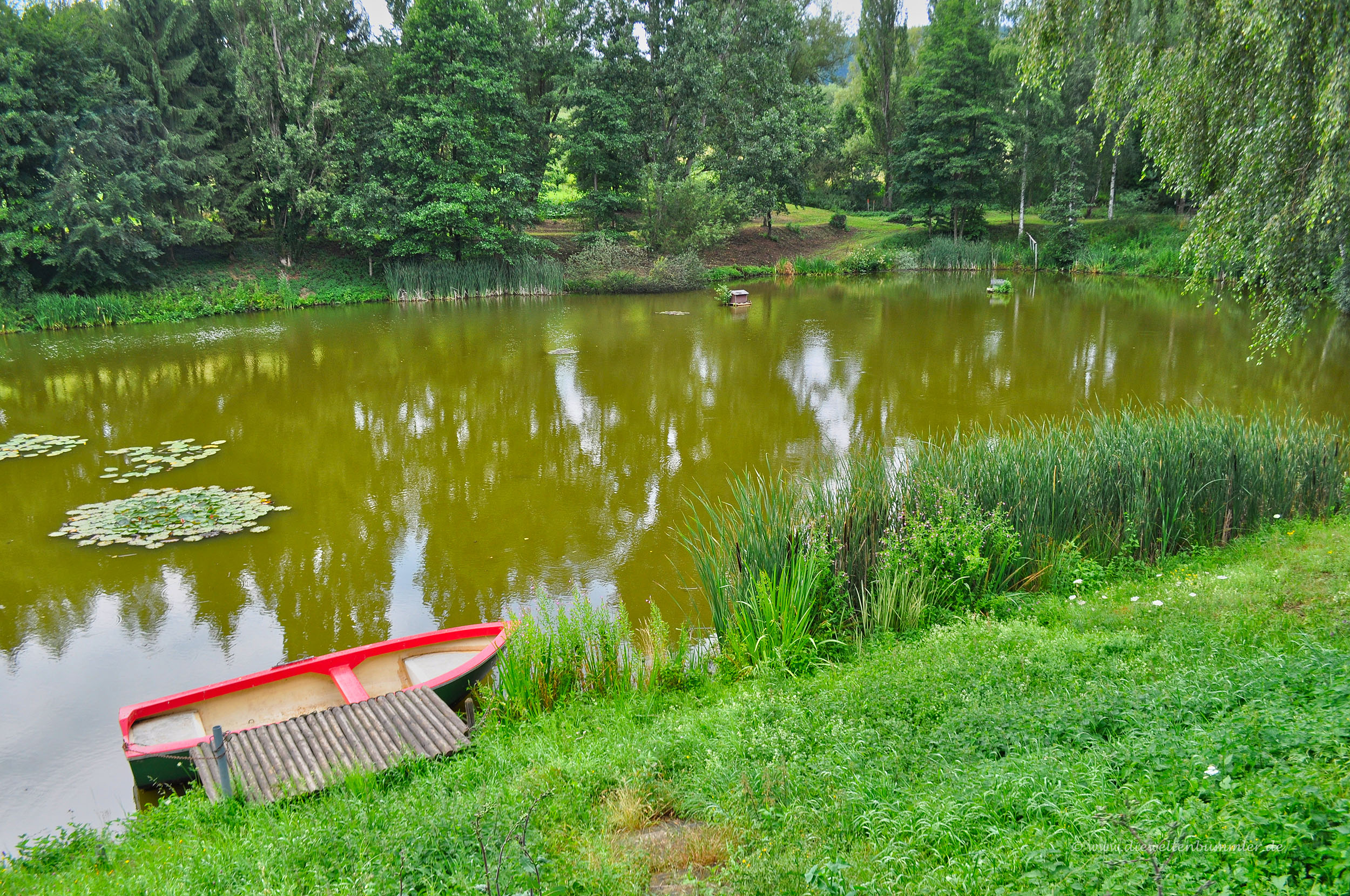 Fröhlich summend genießen wir die Wanderung und beobachten, wie kleine Eidechsen in den Hohlräumen kniehoher Trockenmauern verschwinden. Auf den Mauern wachsen farbenfrohe Blumen, wie die Gemeine Schafsgarbe mit ihrem leuchtenden Weiß und wir erreichen schon bald einen idyllisch gelegenen Fischweiher (GPS: 49.806904, 6.803711). Aus der angrenzenden Schutzhütte schauen wir bei einer kleinen Pause den Anglern zu. Anschließend machen wir uns auf den weiteren Weg. Kleine Frösche hüpfen in Scharen über den asphaltierten Boden. Eine kleine Quelle unter Birken lädt uns zu einer weiteren Erholungspause ein (GPS: 49.810532, 6.805018).