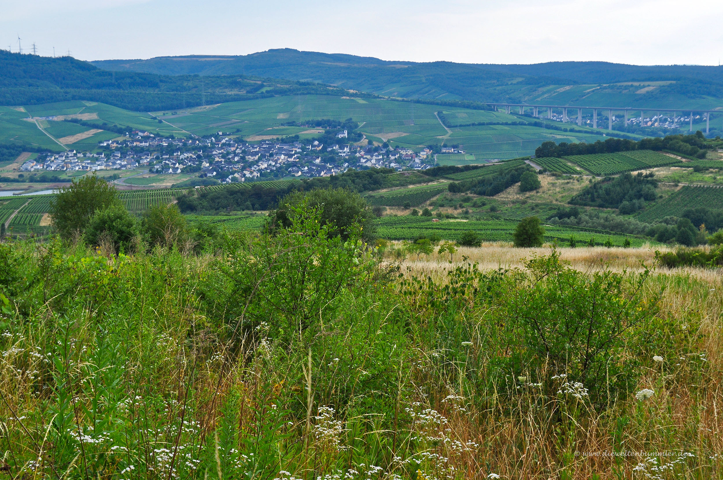 Doch schon die erste Möglichkeit nach links nutzen wir, um die letzten Häuser Mehrings hinter uns zu lassen und an den ersten Weinbergen entlang zu wandern. Wir folgen der Beschilderung des Wanderwegs R 5 und gewinnen dabei stets an Höhe. Auf der rechten Seite erheben sich die sanften Hügel der Eifel, die uns noch auf der Wanderung begegnen werden. Gleichzeitig blicken wir links auf die Häuser von Mehring hinab und sehen am anderen Moselufer eine Autobahnbrücke, welche die Berge des Hunsrücks miteinander verbindet. Auf dem asphaltierten Weg wandern wir zwischen den Weinbergen. Sie werden gelegentlich von Obstbäumen unterbrochen werden und erinnern uns an eine Vielzahl von Weinliedern.
