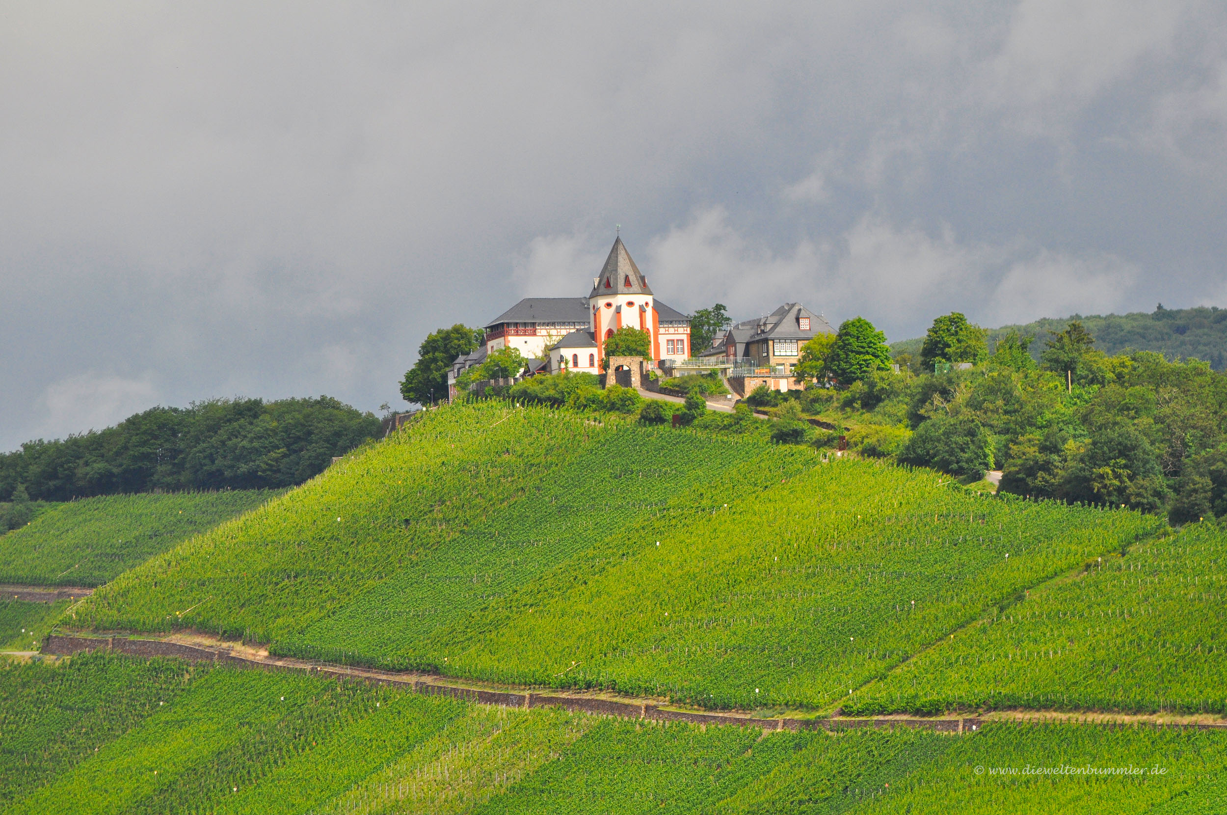Entlang dem Moselufer wandern wir flussaufwärts, nur vereinzelte Radfahrer überholen uns auf der ruhigen Strecke. Wir passieren die Anlegestelle der Fähre nach Briedel (GPS: 50.023571, 7.152805), welche nur Dienstags, Donnerstags und am Samstag zwischen 8 und 12 Uhr und zwischen 13 und 17.30 Uhr verkehrt. Statt der Fähre schauen wir den Gänsen zu, die mit einem lauten Schnattern knapp über dem Wasser der Mosel ihre Flügel schwingen und wandern auf dem gepflasterten Weg bis wir wenig später wieder durch die Weinberge laufen. Sanft steigt unser Weg an, Sitzbänke laden uns zu einer kleinen Pause ein und die vor uns liegende Marienburg nähert sich mit jedem Schritt. Wir beobachten erneut das farbenfrohe Gefieder der Stieglitze und erreichen nach kurzer Zeit die bereits bekannte Gabelung, an der wir weiter bergauf unseren Parkplatz passieren und noch ein kleines Stück bis zur Marienburg (GPS: 50.043629, 7.13652) wandern.