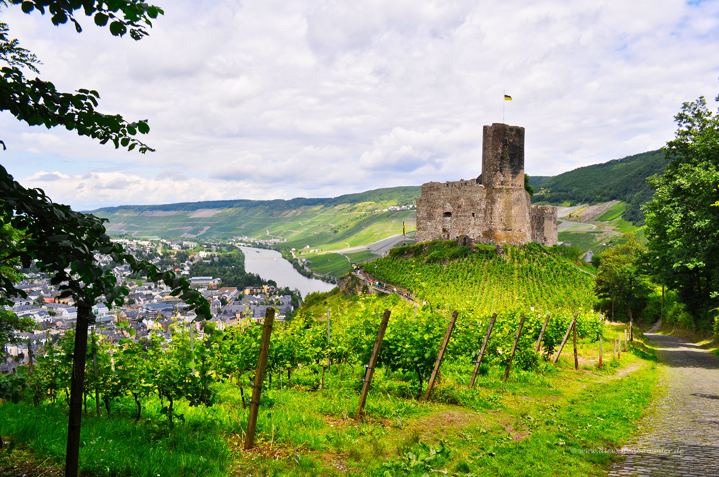 Der Weg führt deutlich bergauf und bringt uns schon nach wenigen Metern aus dem rummeligen Bereich der Ortschaft hinaus. Kaum haben wir die letzten Häuser von Bernkastel hinter uns gelassen, wandern wir zwischen Weinbergen und sehen zu unserer Linken die mächtige Burg Landshut, die stolz über der Stadt thront. Doch zunächst spazieren wir zwischen den Trockenmauern der Weinbergterrassen, auf denen zahlreiche Weißweintrauben gedeihen.