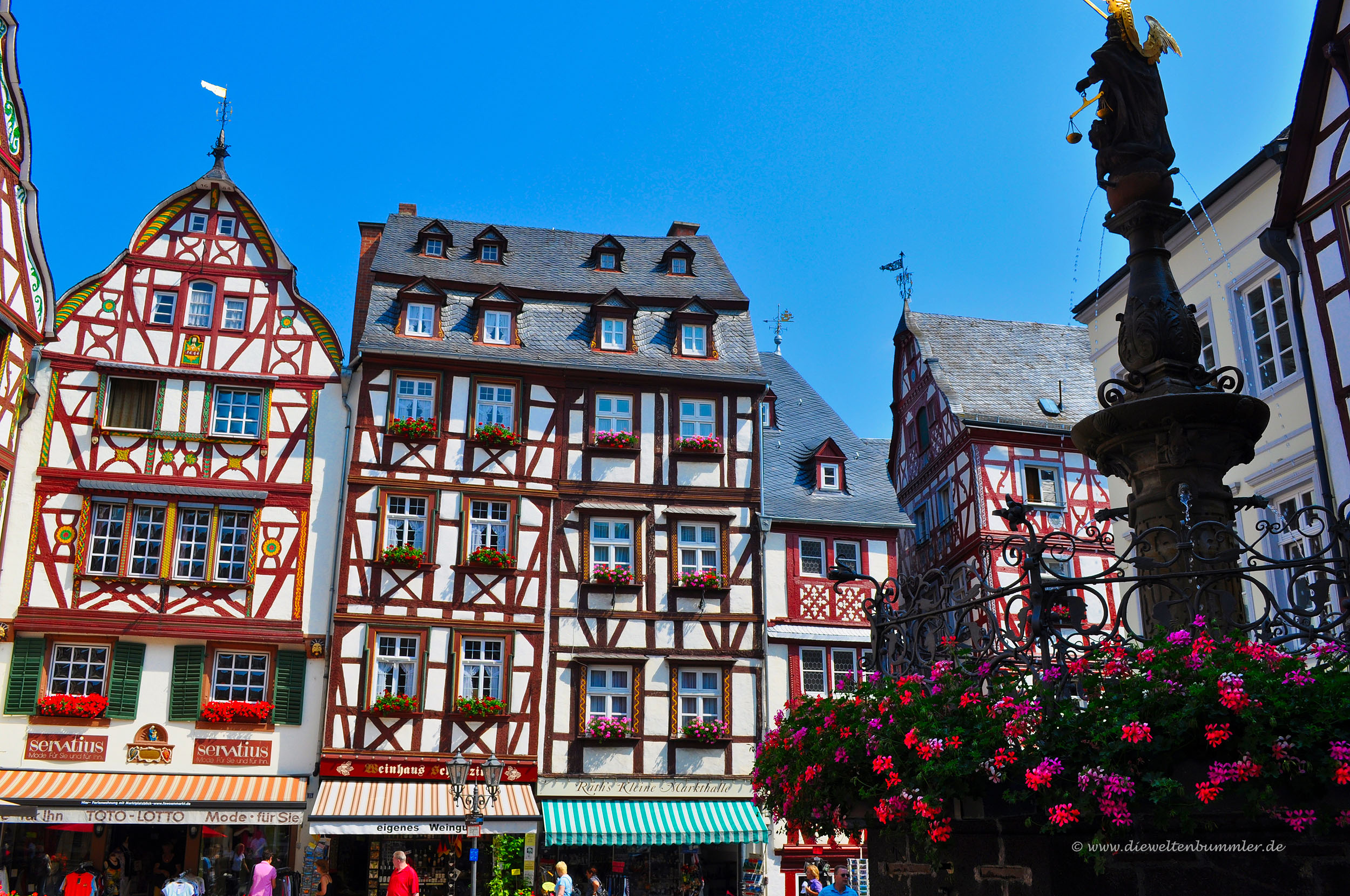 Während Radler des Moselradwegs eine Pause am Marktbrunnen einlegen und Touristen gemütlich durch die Gassen schlendern, treffen wir die Entscheidung, ob wir das pittoreske Städtchen besichtigen und in einem der unzähligen Cafés die schöne Wanderung Revue passieren lassen oder geradeaus über den Marktplatz spazieren und durch den angrenzenden Kirchhof zur Mosel und damit zu unserem Ausgangspunkt zurückkehren.
