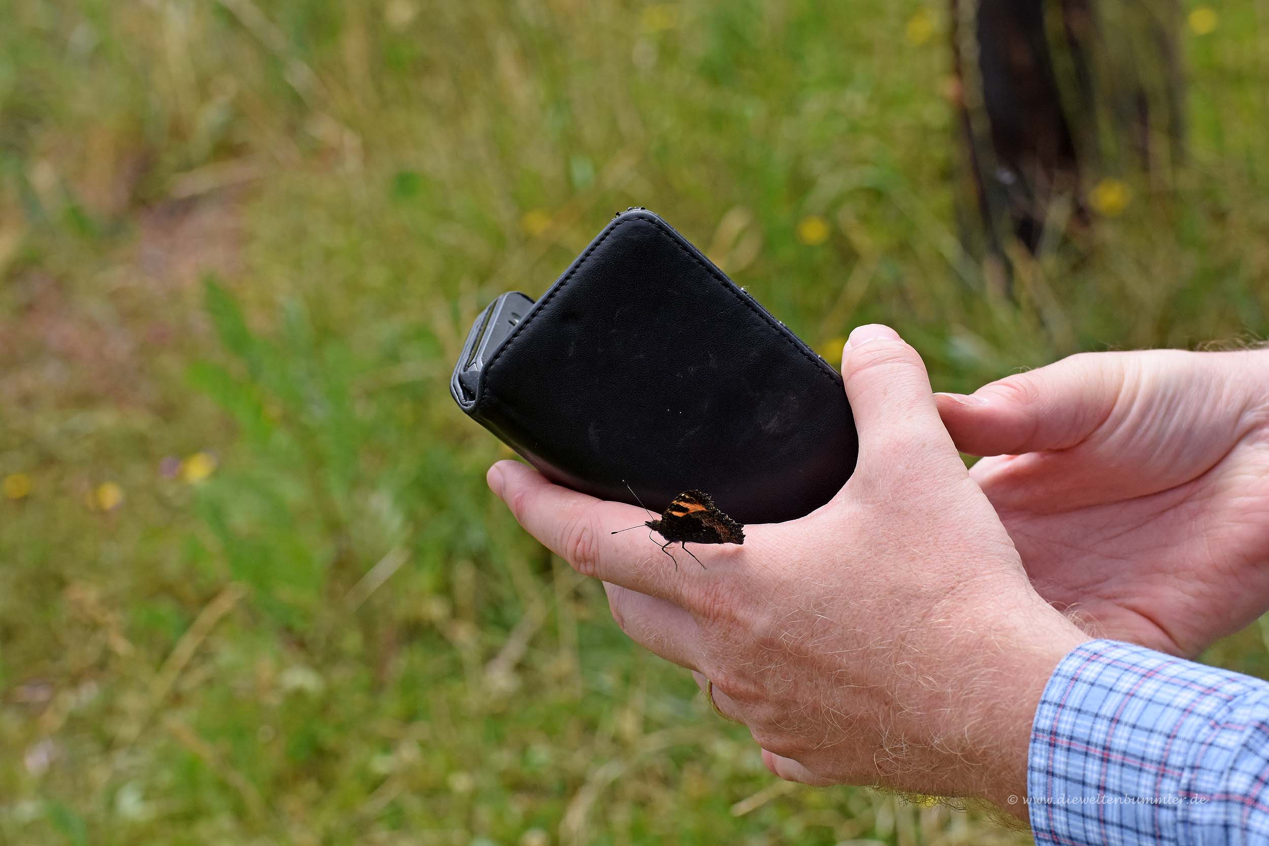 Das hat uns besonders gefreut, da der Rote Apollo, wie dieser Schmetterling auch heißt, in Deutschland fast nur noch an der Mosel anzutreffen ist und selbst hier vor einigen Jahren kurz vor der Ausrottung stand. Aber es flatterten auch andere Schmetterlinge um uns herum, so wie das Tagpfauenauge, dass sich gemütlich auf meine Hand setzte, während ich gerabe bei einer kleinen Rast aufs Telefon schaute.