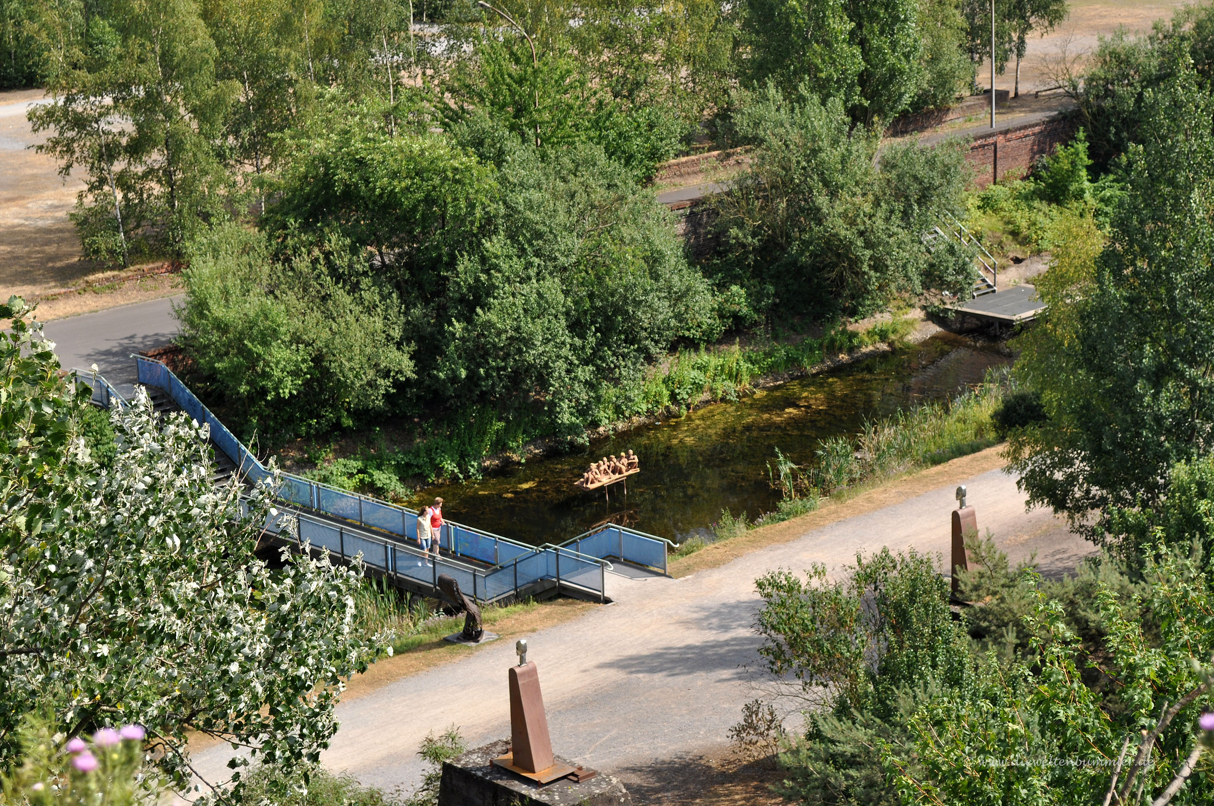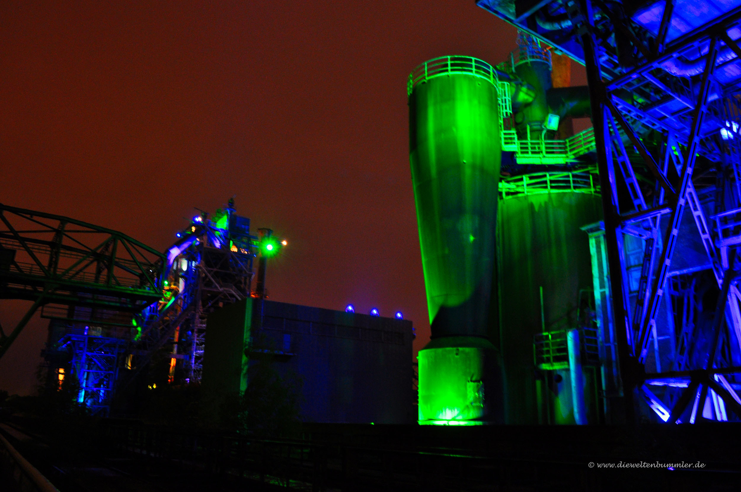 Es dauert nicht lange, bis wir an einem kleinen Amphitheater vorbeikommen und uns nach einer kleiner Steigung auf einem Aussichtspunkt befinden. Vor uns liegt das alte Hüttenwerk in seiner vollen Größe. Insbesondere in den Abendstunden, wenn es von Johnathan Parks Lichtinstallation illuminiert wird, ist es nicht nur für Hobbyfotografen ein spezieller Genuss.
