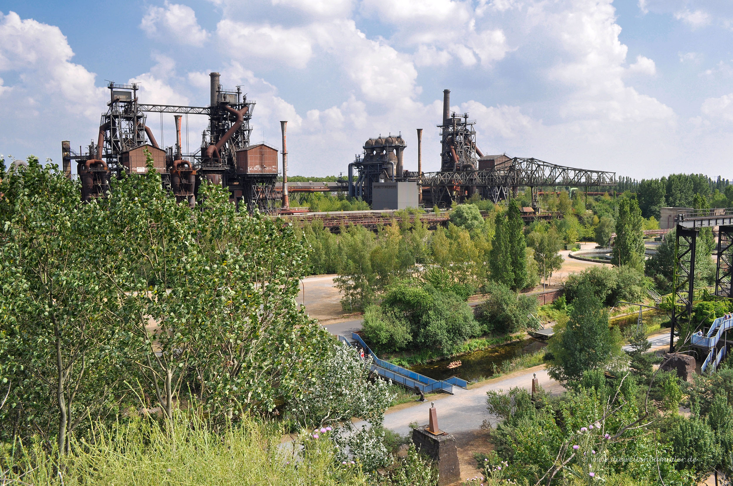 Wandern in der Industriekultur – das bedeutet: Ein Biotop neben einer Autobahn, ein Bauernhof als Teil eines Hüttenwerks und die erfolgreiche Rückeroberung der Natur auf einem Gelände, auf dem jahrzehntelang Schwerindustrie vorherrschte. Diese Kontraste sind bei einer – auch kulturell interessanten – Wanderung unter rostigen Stahlanlagen, auf ehemaligen Bahndämmen und an kanalisierten Flüssen deutlich zu sehen. Empfehlenswert ist eine Wanderung in den Abendstunden eines Wochenendes, wenn der mächtige Industriekomplex durch Lichtinstallationen in bunte Farben eintaucht.