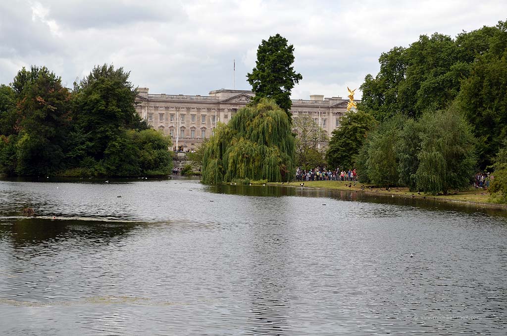 Gleich gegenüber erstreckt sich nämlich der St. James Park, der den gleichnamigen See beherbergt. Am Seeufer kann man den Park wunderbar auf seiner gesamten Länge durchqueren und dabei prächtigen Pelikanen und hungrigen Grauhörnchen begegnen. Von einer Brücke aus sieht man im Westen eines der wohl berühmtesten Gebäude der Welt – den Buckingham Palast. Architektonisch finden wir ihn jetzt nicht so spektakulär. Deswegen lassen wir den Palast links liegen, überqueren die Straße The Mall und befinden uns plötzlich im Green Park.
