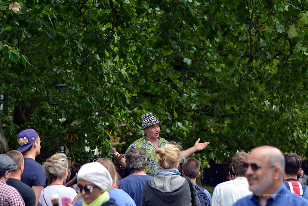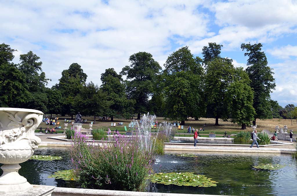 Der See wird von einer Brücke überspannt, die gleichzeitig eine Grenze bildet. Aber eine schöne Grenze, denn vom Hyde Park aus kommen wir über diese Brücke direkt in die Kensington Gardens. Auch hier kann man wieder ewig lange spazieren, entspannen und Skulpturen besichtigen. Die bekannteste dürfte die Figur von Peter Pan sein. Im Norden biegen wir hinter den sogenannten italienischen Gärten rechts ab, wandern wieder durch den Hyde Park und schauen zum Abschluss der Tour interessiert zu, wie in der Speaker’s Corner heftig diskutiert wird.