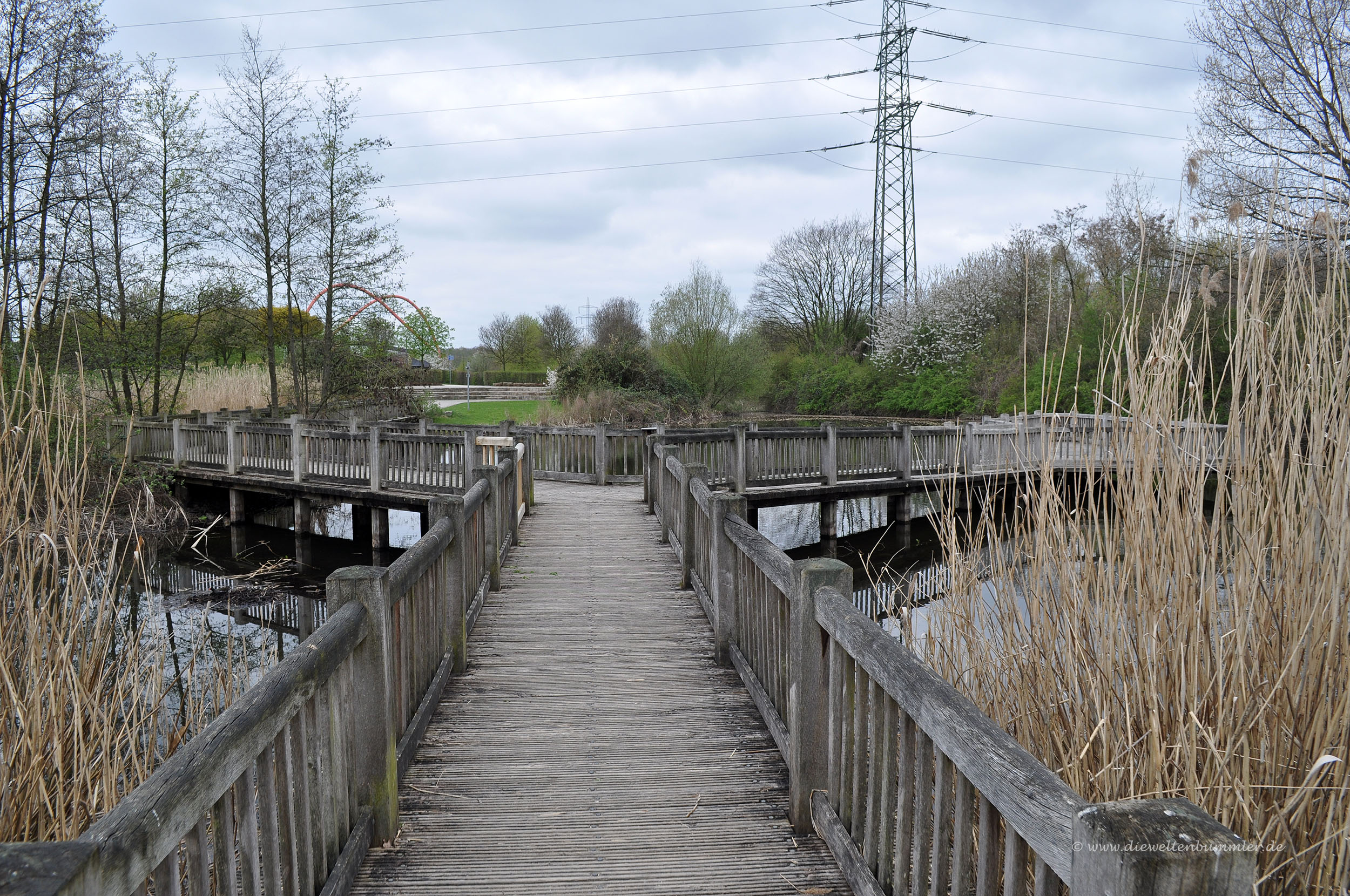 Am Europator halten wir uns geradeaus und gehen am Ende halbrechts in einer Kurve an einem Naturlehrpfad vorbei. Leider sind die dortigen Einrichtungen in einem etwas verfallenen Zustand. Automatisch gelangen wir zum Kinderland, nachdem wir auf einem Steg ein Biotop überquerten. Wenn Kinder trotz dieser Wanderung noch nicht müde sind, dann können sie es spätestens auf diesem großen Kinderspielplatz werden. Hinter dem Kinderland halten wir uns rechts und überqueren auf dem Wahrzeichen des Nordsternparks, der roten Stahlrohrbogenbrücke den Rhein-Herne-Kanal. Direkt dahinter gelangen wir rechts wieder zum Parkplatz.