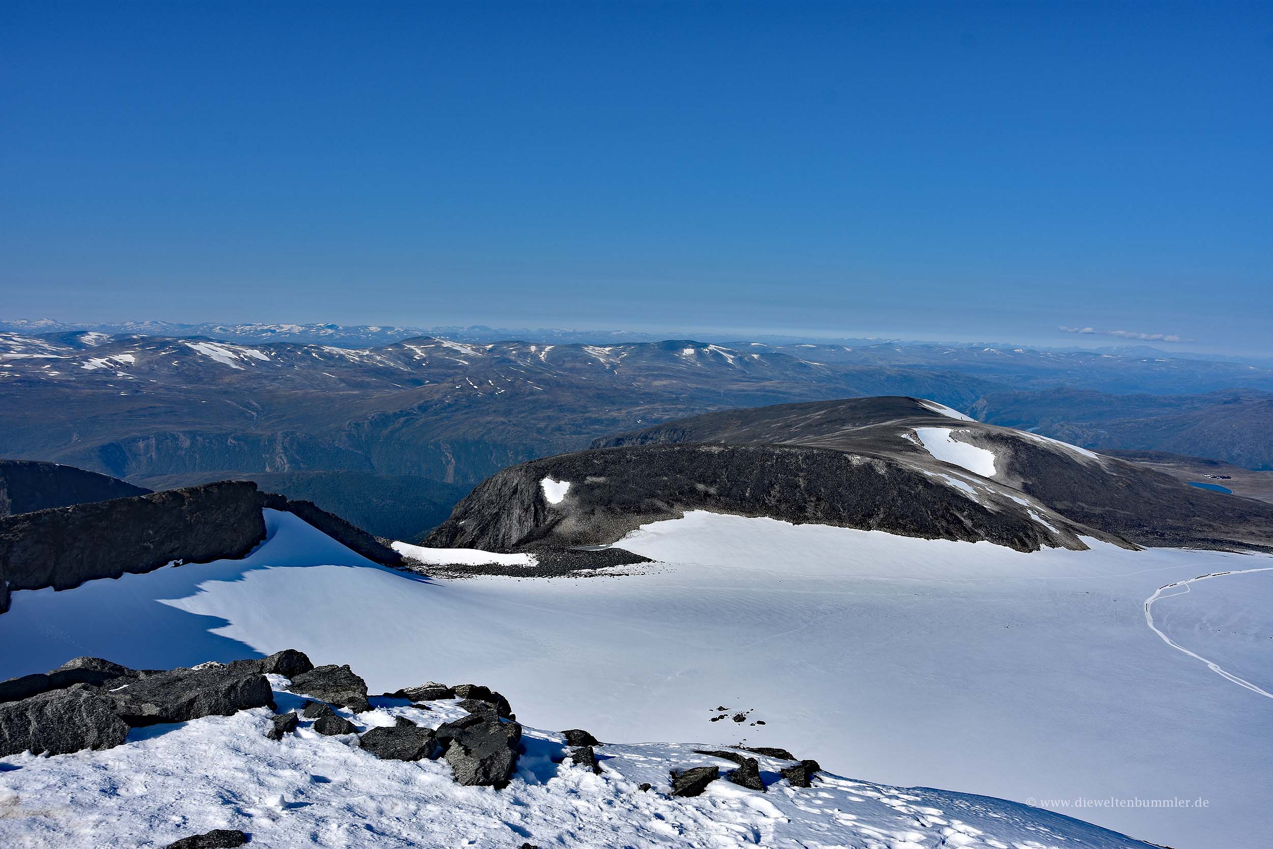 Trotzdem war auch der Abstieg anstrengend, besonders dann, wenn es über sehr große Felsbrocken wieder zu klettern galt. Junge Wanderer hüpfen von Fels zu Fels und ziehen deutlich schneller an uns vorüber. Aus dem Alter sind wir aber raus und denken lieber an unsere Knie. Da bin ich dann doch eher für Langlebigkeit meiner Gelenke. Daher waren wir auch sehr spät erst wieder unten an der Spiterstulen Turisthytte. Mit rund 12,5 Stunden zählt diese Tour zu einer unsere längsten, konnte unseren persönlichen Rekord aus dem Thüringer Wald jedoch nicht überbieten. Dennoch waren wir deutlich länger unterwegs als der Durchschnitt. Denn in der Touristinformation in Lom sagte man uns, dass man 4 Stunden rauf und 2,5 Stunden hinab brauchen würde. Wir brauchten jedoch sechs Stunden rauf und vier wieder runter. Aber wie gesagt, wir ließen uns auch Zeit. Anschließend konnten wir weiter mit dem Wohnmobil durch Norwegen.
