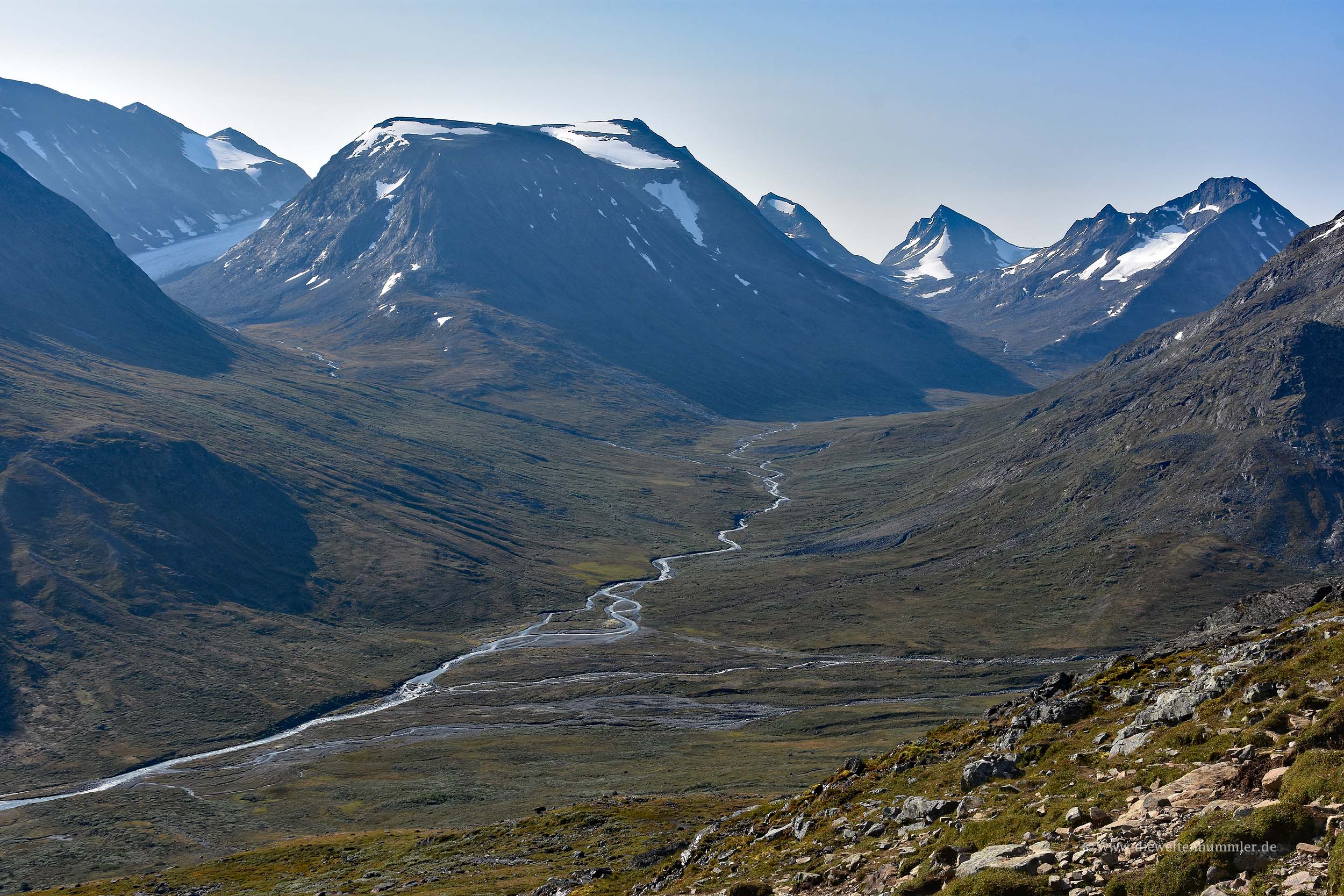 Nach einer geruhsamen Nacht machten wir uns dann auf den Weg nach oben. Pingu war im Rucksack verstaut, was vom Gewicht her natürlich ein wenig beschwerlich ist. Aber wir hatten ja Zeit. Zunächst überquert man auf einer wackeligen Brücke den Fluss, passiert die Zelte und dann geht es zwischen ein paar Birken auch schon steil hinauf. Weil unser Wohnmobil noch im Schatten parkte und manche Autos gefrorene Scheiben hatten (Ende August!) waren wir mit Mütze, Handschuhe und dicker Kleidung ziemlich warm eingepackt.
