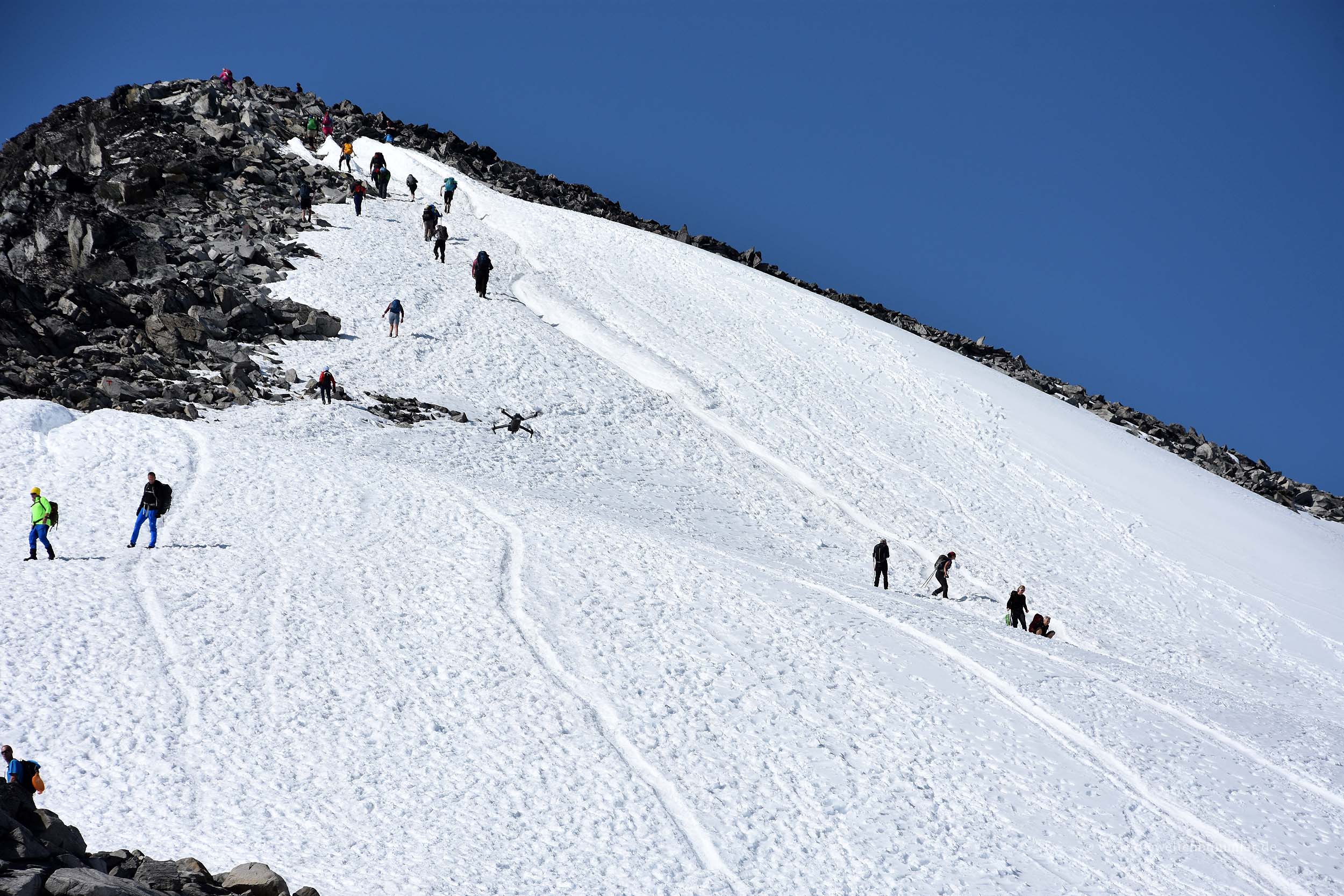 Danach ging es an den Abstieg. Der Einstieg in den Abstieg war ein wenig schwierig, denn wir standen genau vor einer extrem glatten Eisfläche. Sie war nur ein paar Meter breit, doch einige Unvorsichtige hatten sich an der Stelle schon lang gemacht. Und auf Eis hinfallen, hier oben auf dem Gipfel, das wollten wir nicht gerade. Also gingen wir in die Hocke und arbeiteten uns Meter für Meter hinab bis wir Schnee erreichten, auf dem wir deutlich entspannter hinab gehen konnten. Und dann ging es auch recht flott. Weil man so tief in den Schnee einsinkt, konnten wir mit großen Schritten mühelos an Höhe verlieren.