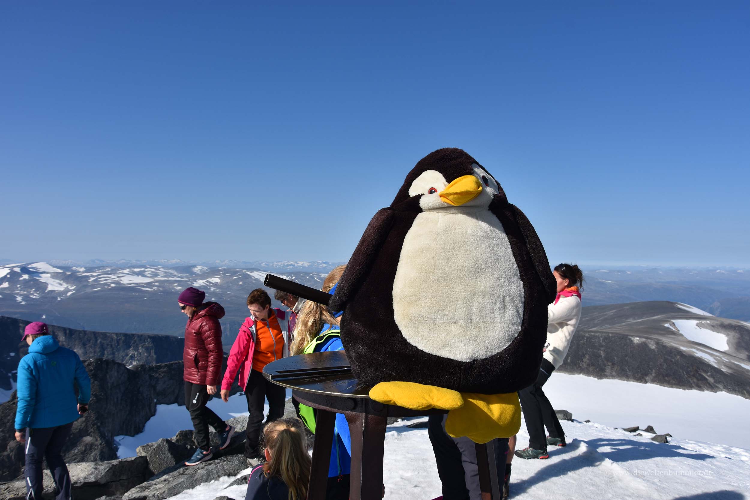 Es dauerte noch eine Zeit, doch irgendwann war es dann tatsächlich geschafft. Wir hatten den Gipfel erklommen. Oben steht eine Hütte, in der wir uns etwas zu trinken kaufen konnten. Das tat gut. Wasser hatten wir ja genug dabei, aber so zwischendurch eine Limo zur Belohnung, warum nicht? Wir hätten auch gerne noch in Ruhe einen Tee getrunken, doch der Laden schloss gerade. Wir hatten es also gerade so eben noch geschafft. Das Wetter lockte zahlreiche Wanderer auf den Gipfel und dementsprechend voll war es oben. Man musste einige Zeit warten, bis man ein Foto vom höchsten Punkt in Norwegen machen konnte. Dabei waren die großen Gruppen, die von der Juvasshütte angeseilt hier waren, schon lange wieder weg. Wie voll mag das erst gewesen sein, als die auch noch dort oben standen?