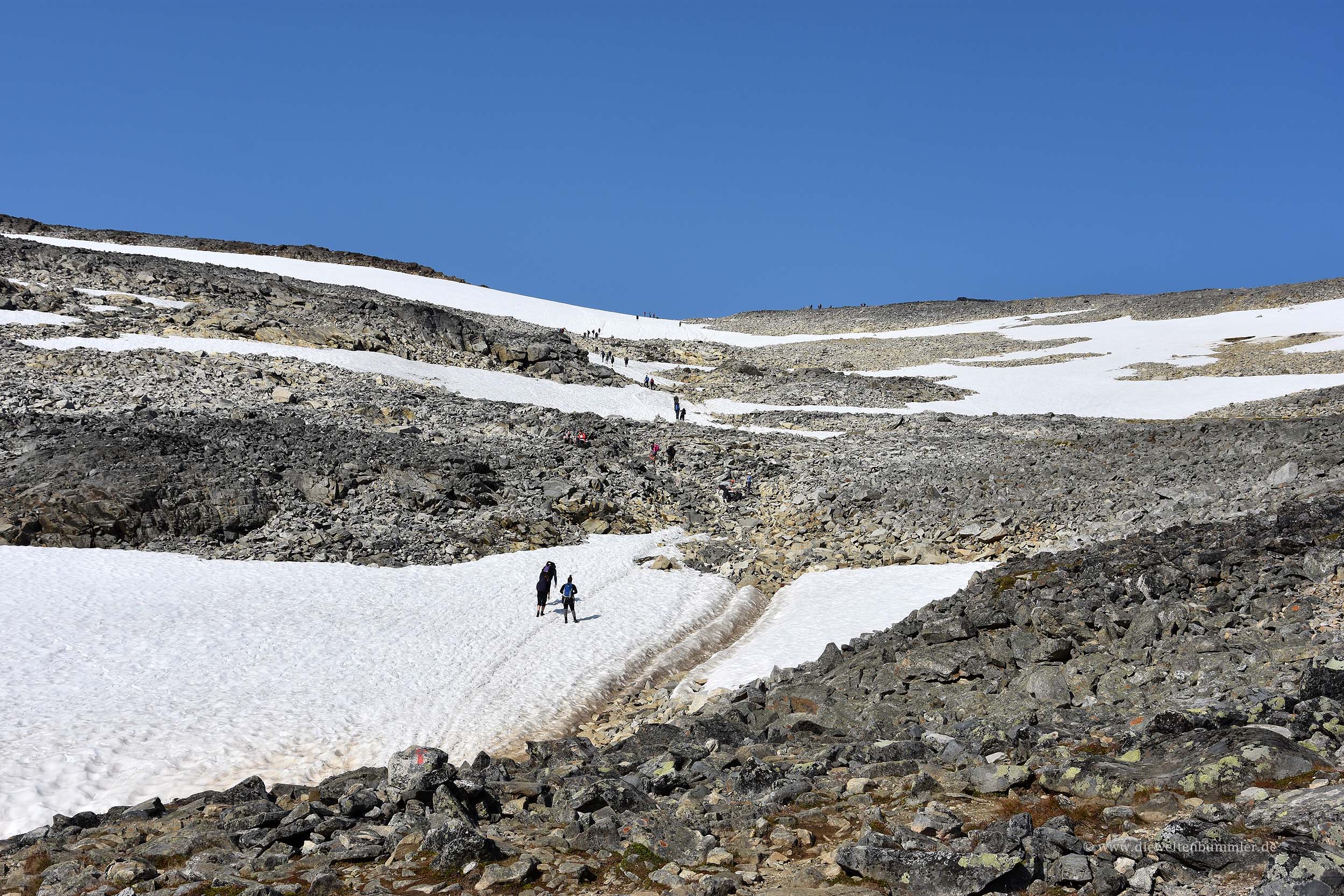 Auch wir wandern weiter und haben wenig später den Gipfel des Keilhaus Topp vor uns. Wieder mal so ein Punkt, der frustrierend sein kann. Denn der Galdhøppigen ist immer noch nicht zu sehen. Dabei ist er mittlerweile gar nicht mehr so weit entfernt. Wir überqueren ein weiteres Schneefeld, das ganz offensichtlich aber auch zu dem Gletscher gehört und steigen hinauf auf den Keilhaus Topp. Was so einfach klingt, kann echt anstrengend werden. Denn der Aufstieg ist völlig vereist und man muss schon gehörig aufpassen, wo man hintritt.