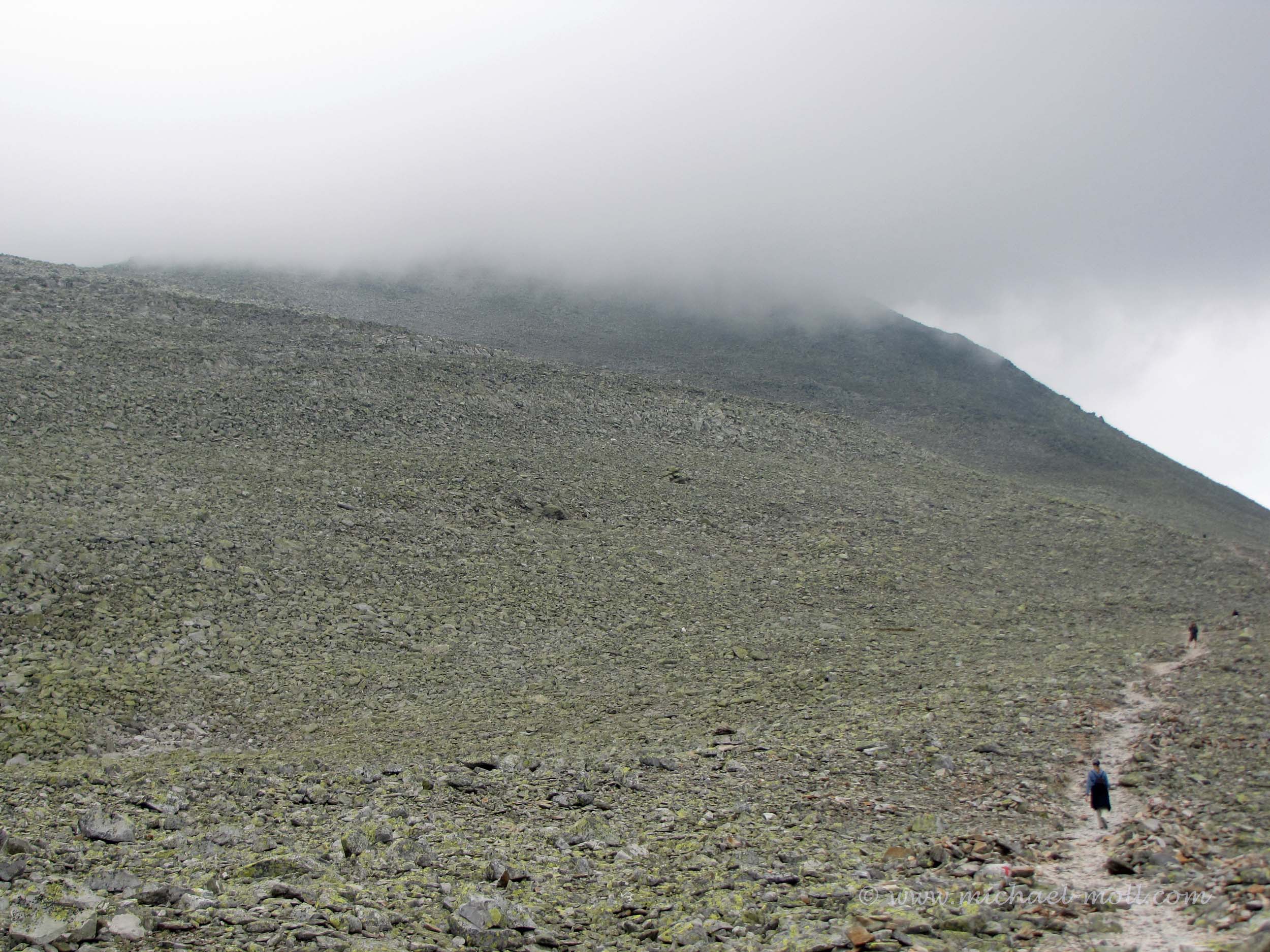 Die eigentliche Wanderung ist dann aber relativ einfach. Es sind ja nur noch rund 700 Höhenmeter, die man durch die karge und felsige Landschaft zurücklegt. Zu Beginn trifft man noch auf einige Schafe, die am Wegesrand grasen. Später ist aber kein Gras mehr da, Schafe dann auch nicht. Der stets ansteigende Wanderweg ist fast durchgehend gerade, bietet also keine Spitzkehren oder bedeutende Kurve, was natürlich dazu führt, dass man immer den Gipfel im Blick hat. Vorausgesetzt, er ist nicht in Wolken verhüllt, so wie es uns lange Zeit ergangen ist. Erst als wir oben auf dem Gipfel des Gaustatoppen standen, lichteten sich die Wolken mal kurz und gaben uns den Blick in die Tiefe frei, wo wir weit unten die Häuser von Rjukan erkennen konnten. Leider war dieser Moment aber schnell vorbei und so lag wenige Augenblicke später unsere Sichtweite bei nur wenigen Metern. Der Gipfel wird von einem hohen Sendemast markiert, neben der in geringer Entfernung eine kleine Wanderhütte auf Besucher wartet.