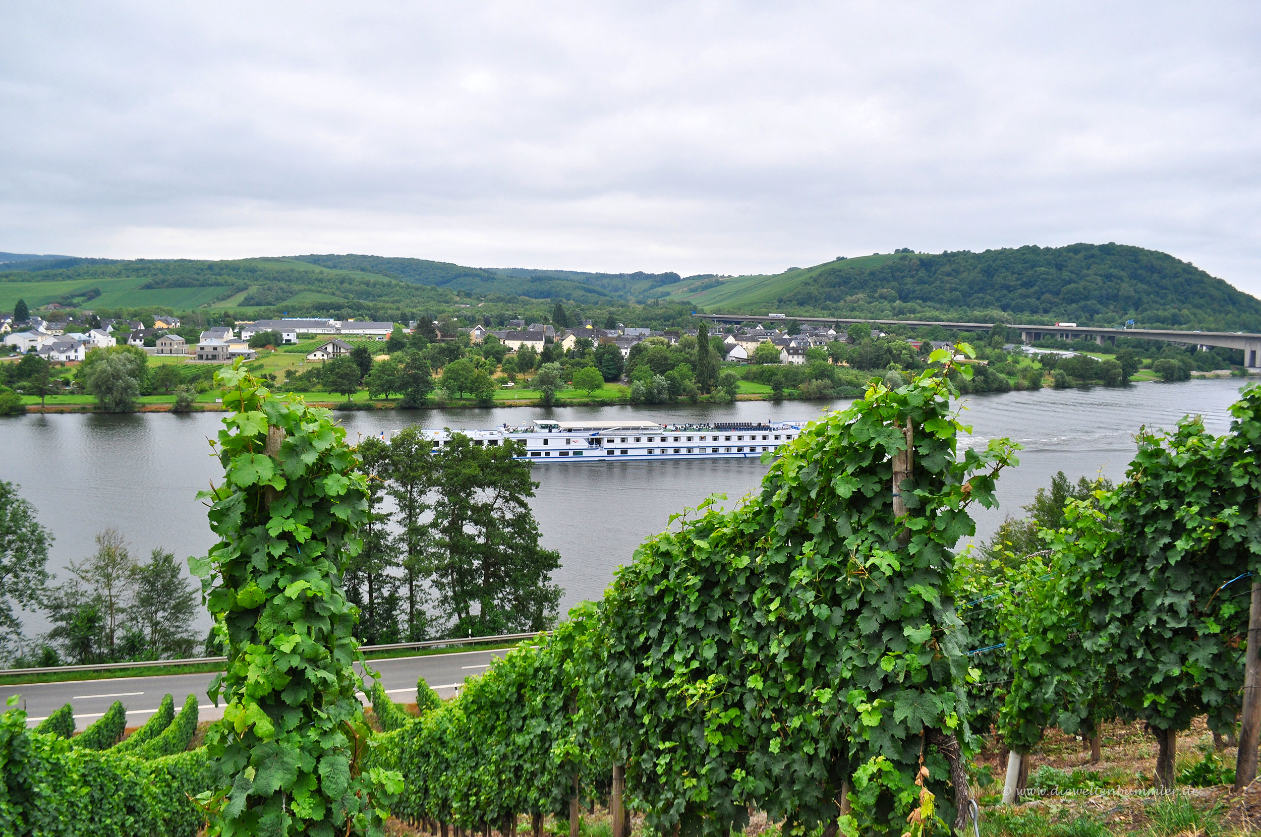 Dabei überqueren wir abermals den Föhrenbach, der in Sichtweite in die Mosel mündet. Schon nach der Unterquerung der Autobahnbrücke verlassen wir die Landstraße wieder. Nach links wendend erreichen wir wieder den ersten Weinberg und biegen sofort an der ersten Möglichkeit nach rechts ab. Während unser Weg sanft ansteigt, wandern wir zwischen den Weinreben auf dem asphaltierten Weg. Wir blicken den Fahrgastschiffen hinterher, die etwas unterhalb auf der Mosel verkehren. An einer Gabelung entscheiden wir uns für den linken Weg und wandern im leichten Auf und Ab an einer hohen Mauer entlang. Immer wieder blicken wir nach rechts und schauen auf die Mosel hinab. Oder wir erahnen auf der linken Seite in der Höhe den Wanderweg, der uns zu Beginn nach Schweich brachte.
