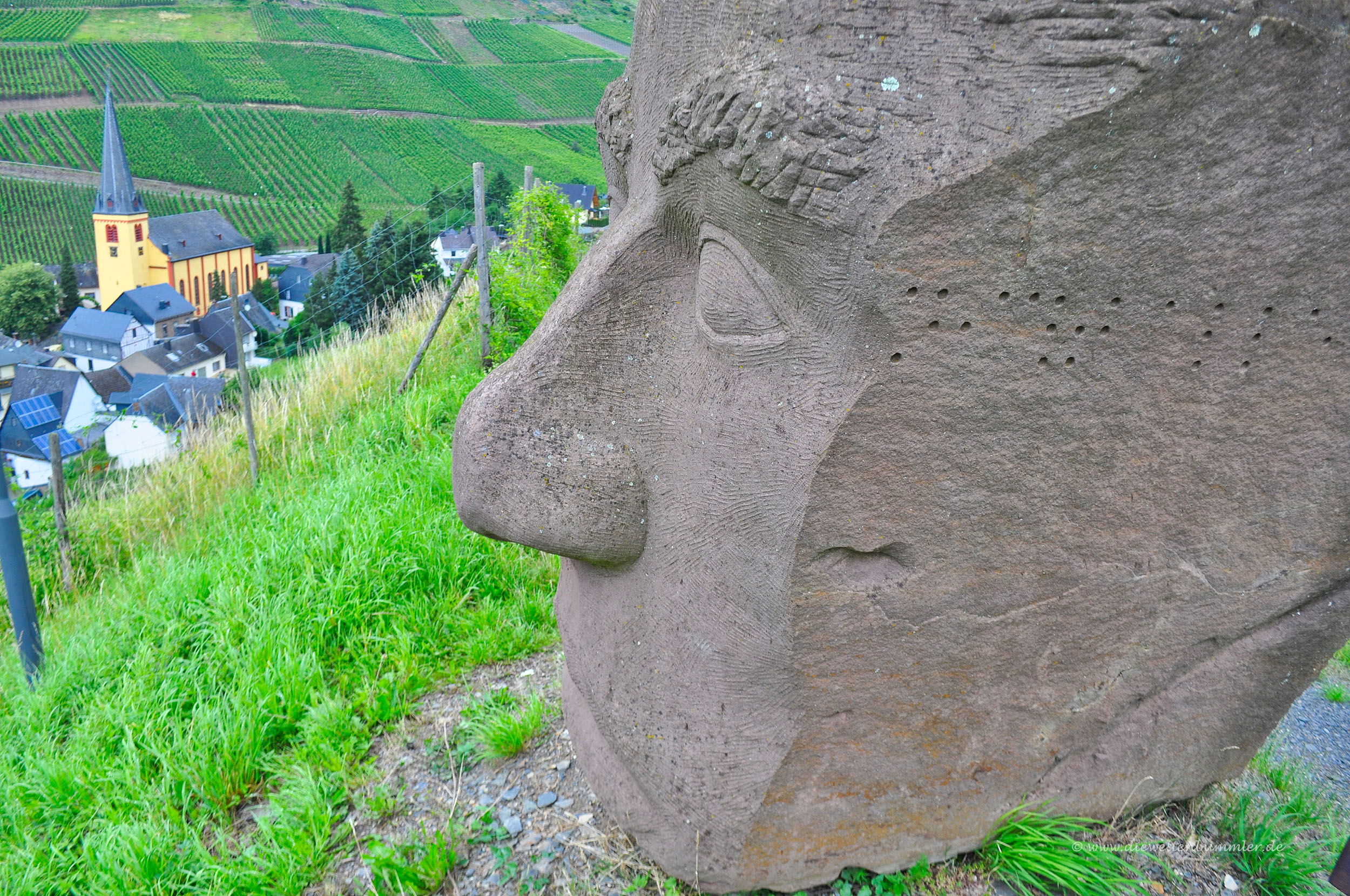 Während der Hang zu unserer Rechten immer steiler in die Höhe ragt, genießen wir die Ausblicke auf die Ortschaft und auf den Römerberg auf der gegenüberliegenden Seite der Mosel. Ein von rechts heran nahender Bach wird von uns überquert und an einer hohen Trockenmauer entlang erreichen wir nach kurzer Zeit die Skulptur eines Kopfes (GPS: 50.08485, 7.212932) mit dem Namen „Ich sehe“. Und sie sieht tatsächlich, nämlich genau auf Senheim hinab und erinnert ein wenig an die berühmten Moai genannten Skulpturen auf den fernen Osterinseln.