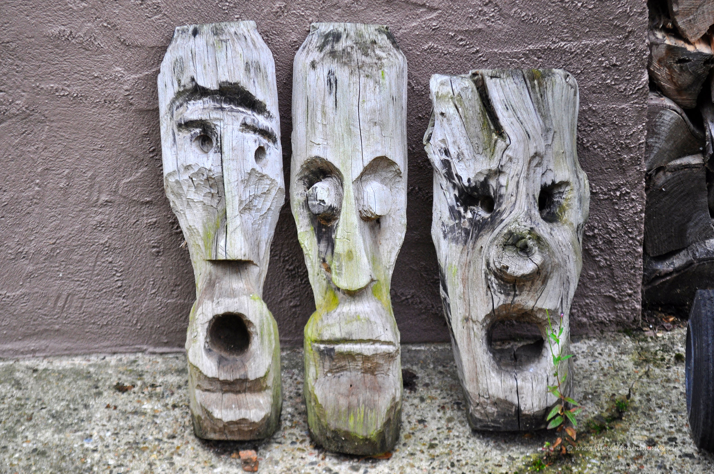 An einem Asphaltweg biegen wir rechts ab und wenden uns sofort wieder nach links. Oberhalb der Rebstöcke auf der rechten Seite erkennen wir farbenfrohe Stelen, welche uns den Beginn eines Skulpturenpfads markieren. Überwiegend Künstler der Region haben Werke geschaffen, die am Rande unseres Wanderwegs installiert wurden. Basaltsäulen und Skulpturen aus Eichenholz wechseln sich ab, wenn man diesem Weg folgt. Leider ist die Beschilderung des Skulpturenpfades in Vergessenheit geraten, weshalb wir weiter geradeaus wandern.
