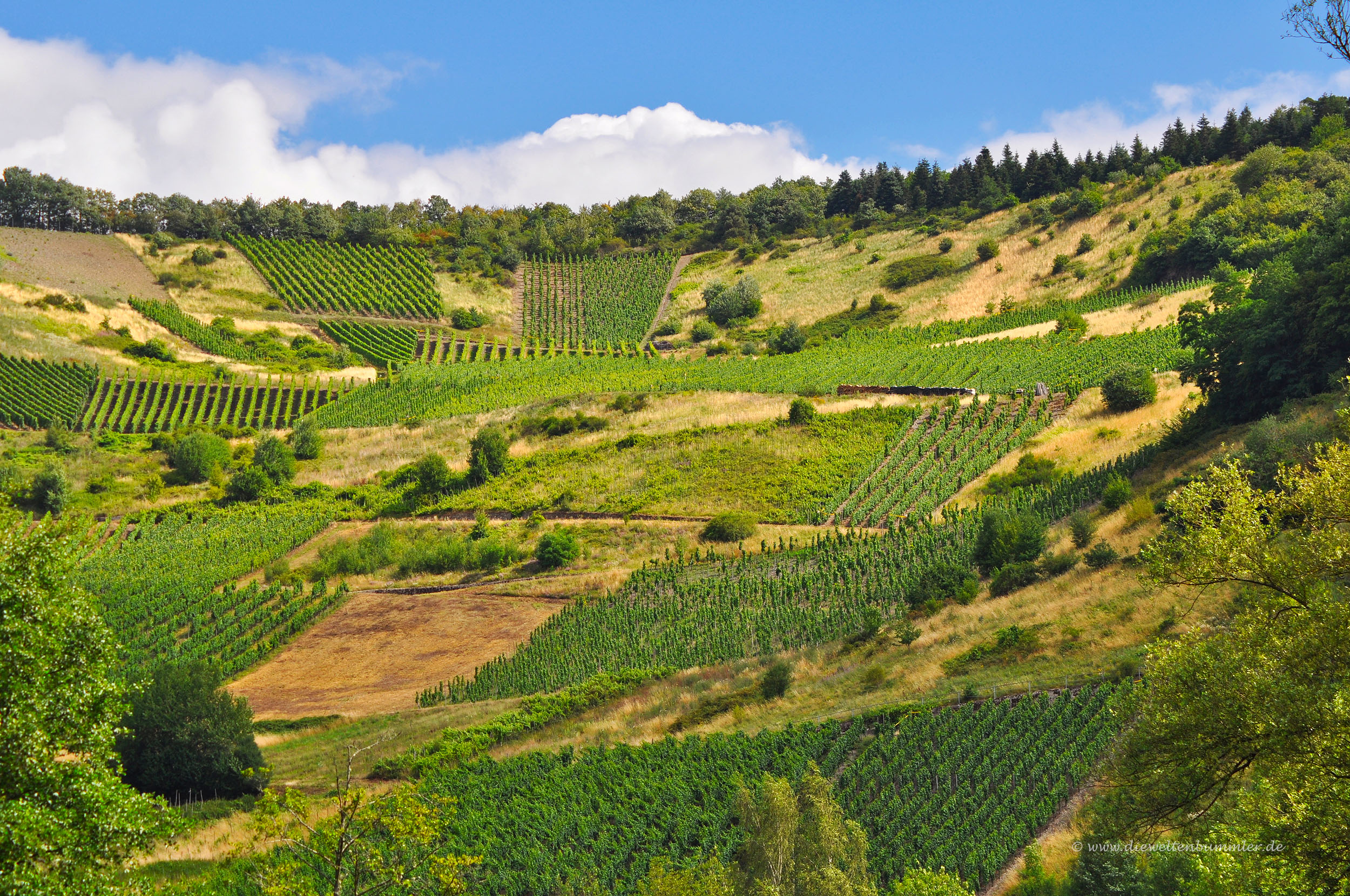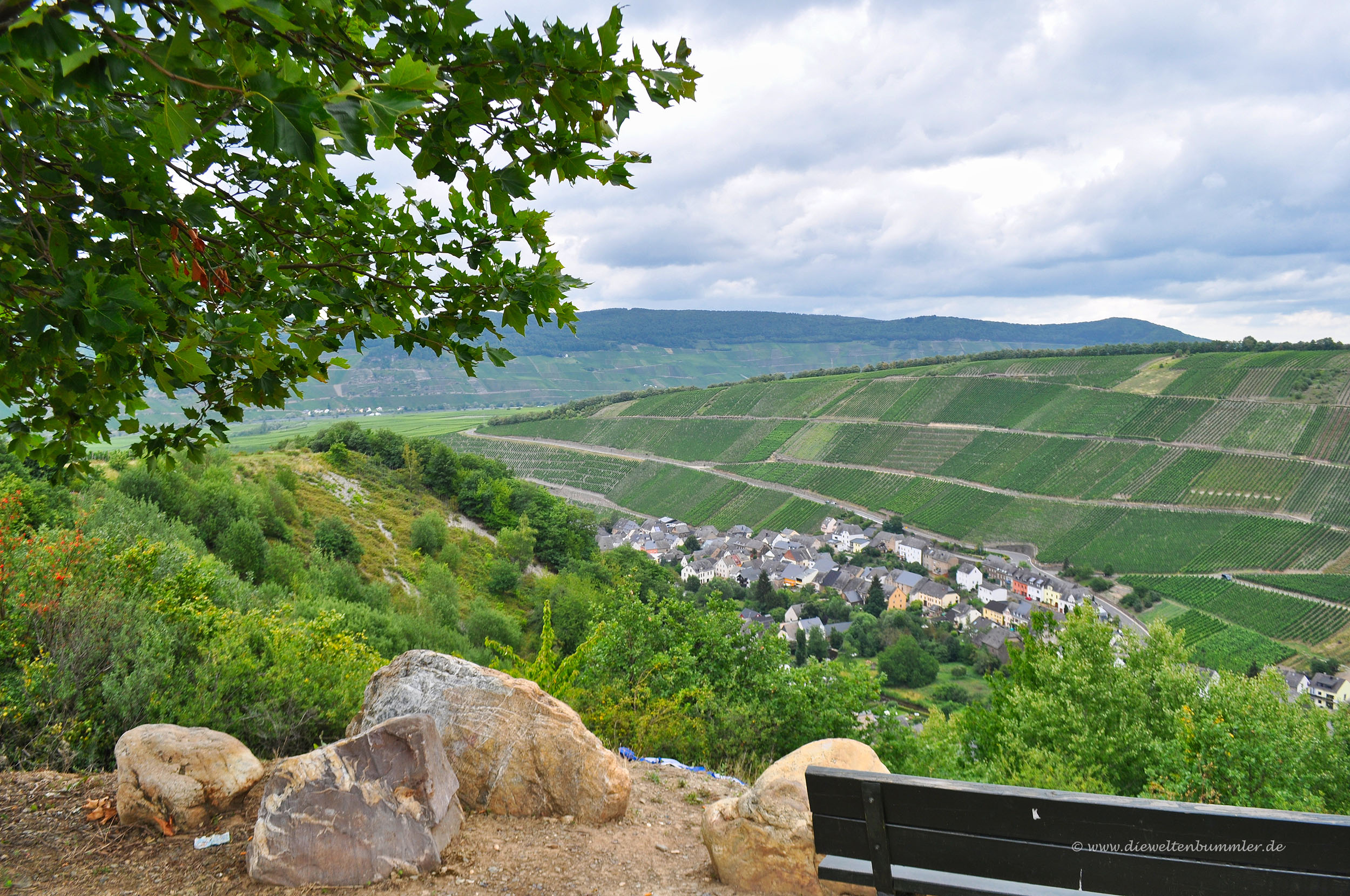 Wenn der Wald zu unserer Rechten zurückweicht, stehen wir an einem Aussichtspunkt und blicken hinunter in das mittlerweile enger gewordenen Dhrontal. Wir setzen unseren Weg fort, wandern an einem Walnussbaum vorbei, halten uns an den Weinbergen rechts und folgen nun dem ausgetretenen Pfad, der uns fortan steil bergab führt. An den Rebstöcken mit ihren vielen Rieslingtrauben vorbei kommen wir zu einer Treppe, die uns durch die Weinlage Roterd führt. Am Treppenende gehen wir nach rechts und genießen die Aussicht über Neumagen-Dhron hinweg auf das Moseltal.