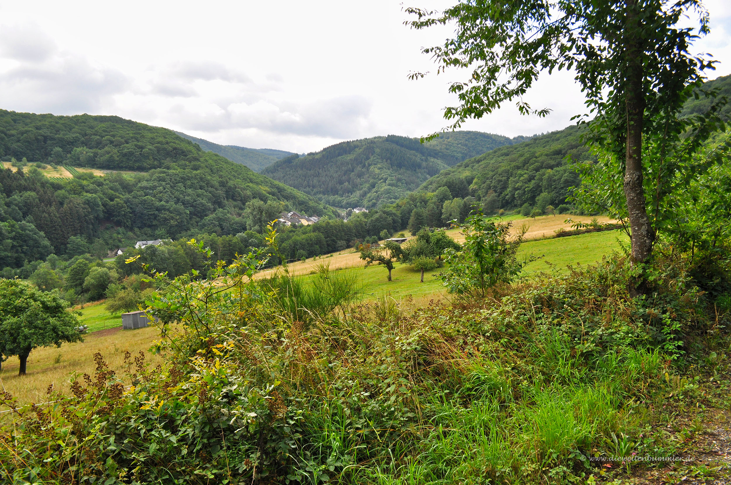 Den kleinen Schotterparkplatz am Ortseingang lassen wir hinter uns. Wir überqueren die Landstraße und werfen zunächst einen Blick auf die kleine Kirche mit ihrer schlichten Rosette über dem Portal. Wir gehen links an der Kirche vorbei in die Stefan-Andres-Tal-Straße und überqueren nach wenigen Augenblicken eine Brücke. Unter unseren Füßen rauscht die Kleine Dhron, die nur wenig später in die Dhron münden wird.