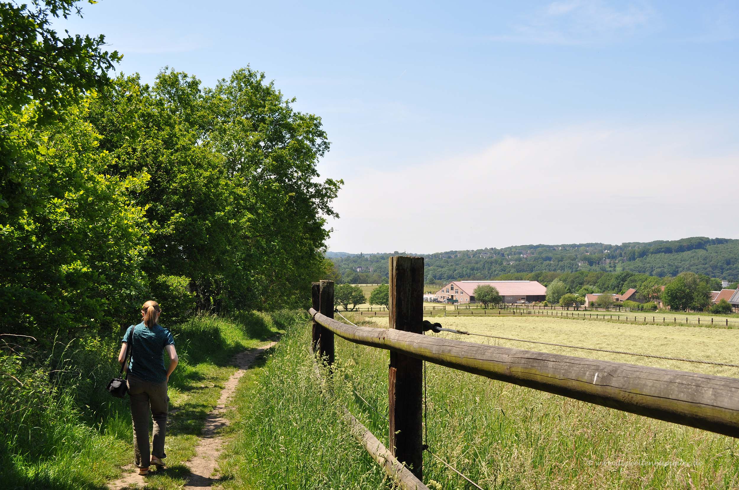 Geradeaus gelangen wir zum Dellmannsweg in Essen-Überruhr, wo wir vor der Hausnummer 128 links und sofort wieder rechts abbiegen. Das Sackgassenschild können wir getrost ignorieren. Hinter den drei folgenden Häusern gehen wir halbrechts und haben vor uns einen schönen Ausblick auf den Schellenberger Wald, der bereits zu Essen-Heisingen gehört. Zwischen Pferdekoppeln wandern wir abwärts. Am Ende der Koppel wenden wir uns zweimal nach links und kommen so in ein kleines Wäldchen hinein. Hier halten wir uns rechts und treffen an einem Jägerzaun auf die Straße Holthuser Tal. Dieser folgen wir nach rechts bergab und sehen nach kurzer Zeit schon wieder die Ruhr vor uns.