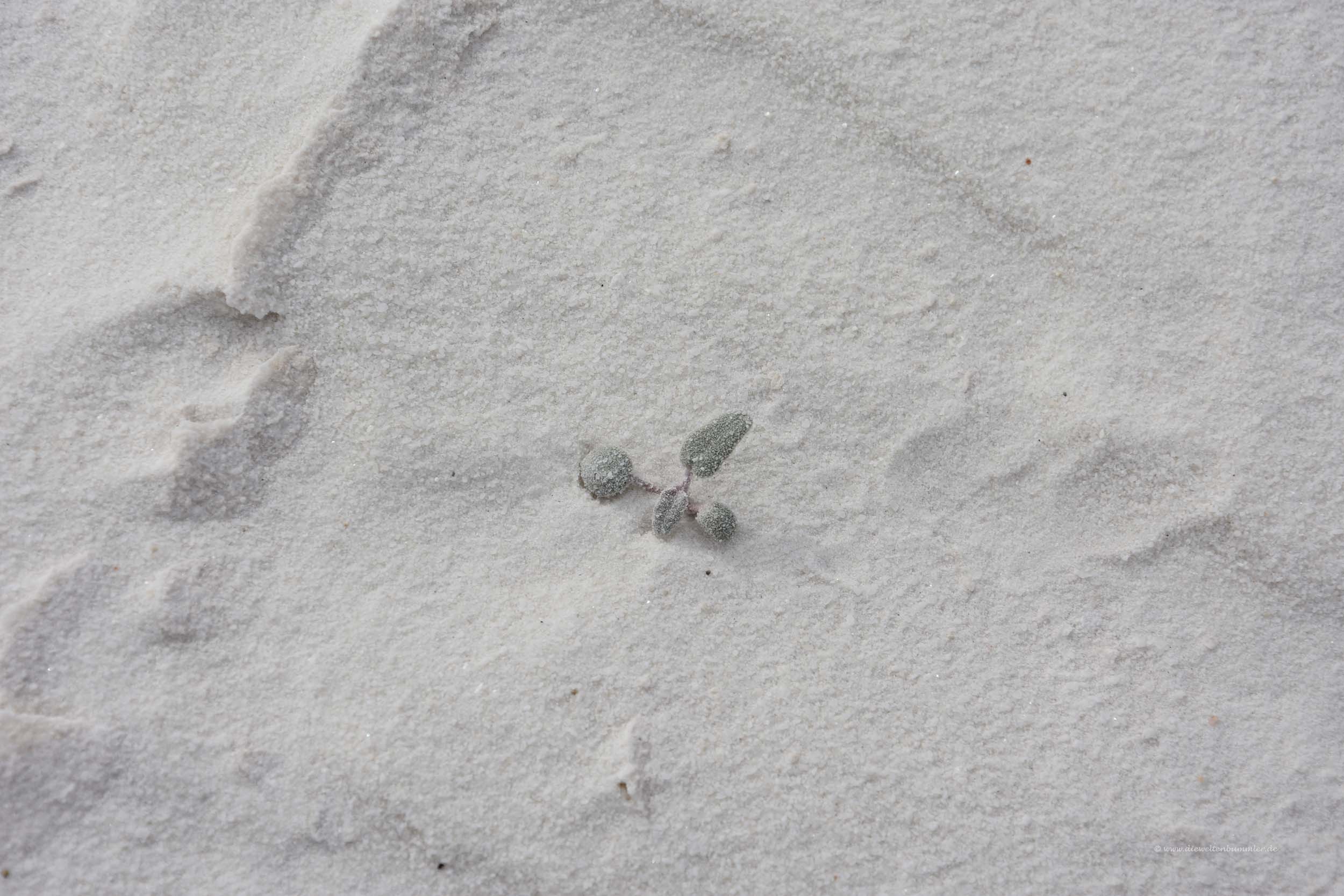 Doch was ist dieses White Sands eigentlich? Nun, der Name sagt es ja schon, es handelt sich um weißen Sand. Doch das Besondere daran ist, dass es sich um Gipssand handelt. Das merkt man auch, wenn man ihn berührt. Es gibt stellenweise Oberflächen, an denen der Sand zu kleinen Platten zusammenklebt und wenn man ihn in die Hand nimmt, dann spürt man das nicht nur, sondern es bleibt auch feiner Sandstaub an den Händen zurück.