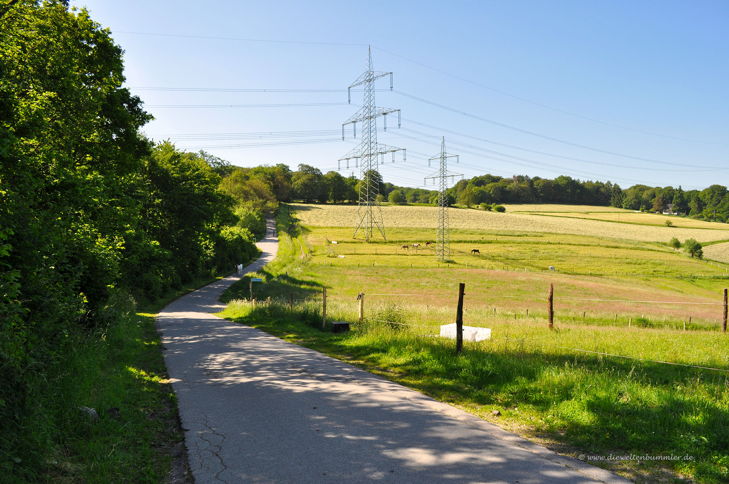Nach einer langen Rechtskurve gehen wir links bis zur T-Kreuzung und folgen dort dem Wandersymbol L abermals nach links in die Kupferdreher Straße. Gleichzeitig befinden wir uns damit auf dem regionalen Radweg der Kaiserroute zwischen Aachen und Paderborn. Zur Rechten können wir deutlich das derzeit jüngste Windrad der Windkraftanlage Velberts und weiter hinten den Langenberger Sender sehen.