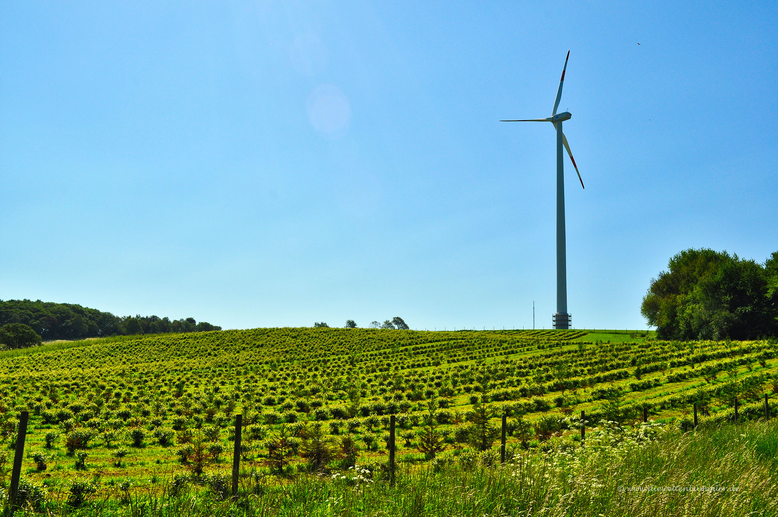 An der Kupferdreher Straße in Velbert wurde das vierte und bisher jüngste Windrad der Stadt errichtet. Es ist zugleich das höchste und stärkste Windrad. Die drei Rotoren erzeugen 1,5 Megawatt und umkreisen eine Nabe, die sich in rund 100 Meter Höhe befindet. Die Kraft dieser Anlage ist auf der verkehrsarmen Straße deutlich zu hören, obwohl sie rund 200 Meter von uns entfernt ist. Die insgesamt fünf Windräder im Kreis Mettmann erzeugen genug Strom, um 2.000 Haushalte mit jeweils vier Personen zu versorgen.