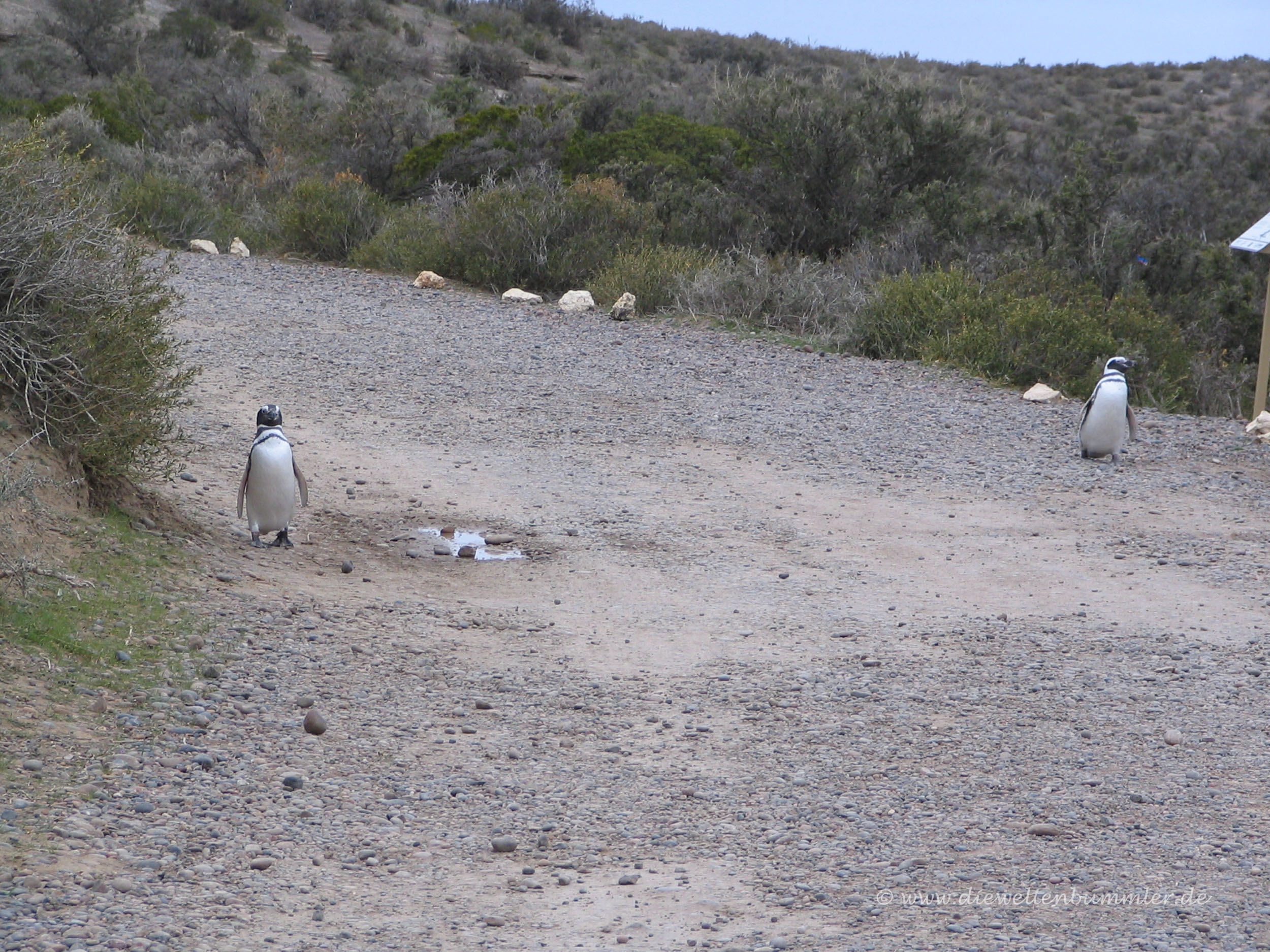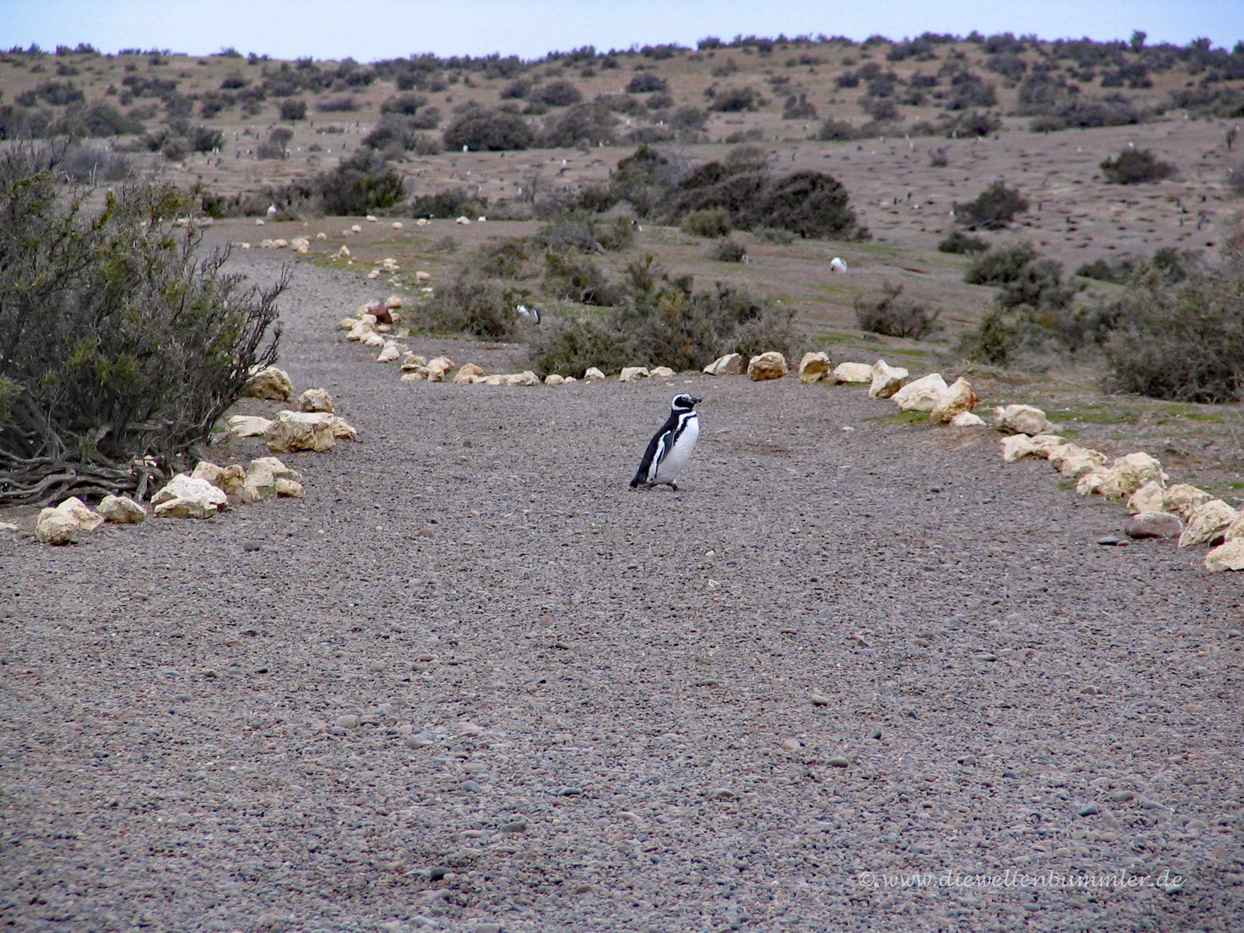 Es gibt einen kurzen Spazierweg durch das Naturreservat Punta Tombo, den man natürlich nicht zu verlassen hat. Das gilt aber nicht für die Pinguine. Diese laufen nämlich kreuz und quer durch das Gebiet und lassen sich nicht davon abhalten zu ihrem Gelege zu watscheln. Die Absperrung des Wegs ist hoch genug, sodass sie drunter her laufen können, während die menschlichen Besucher einfach auf dem Weg bleiben.