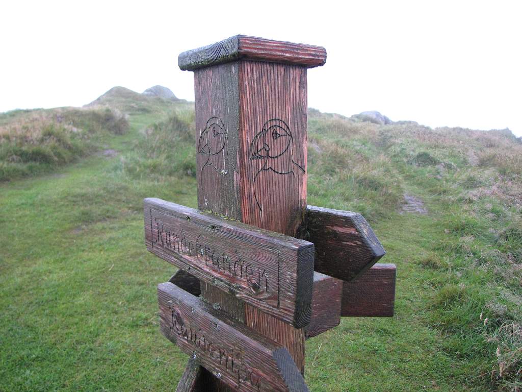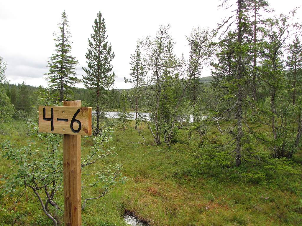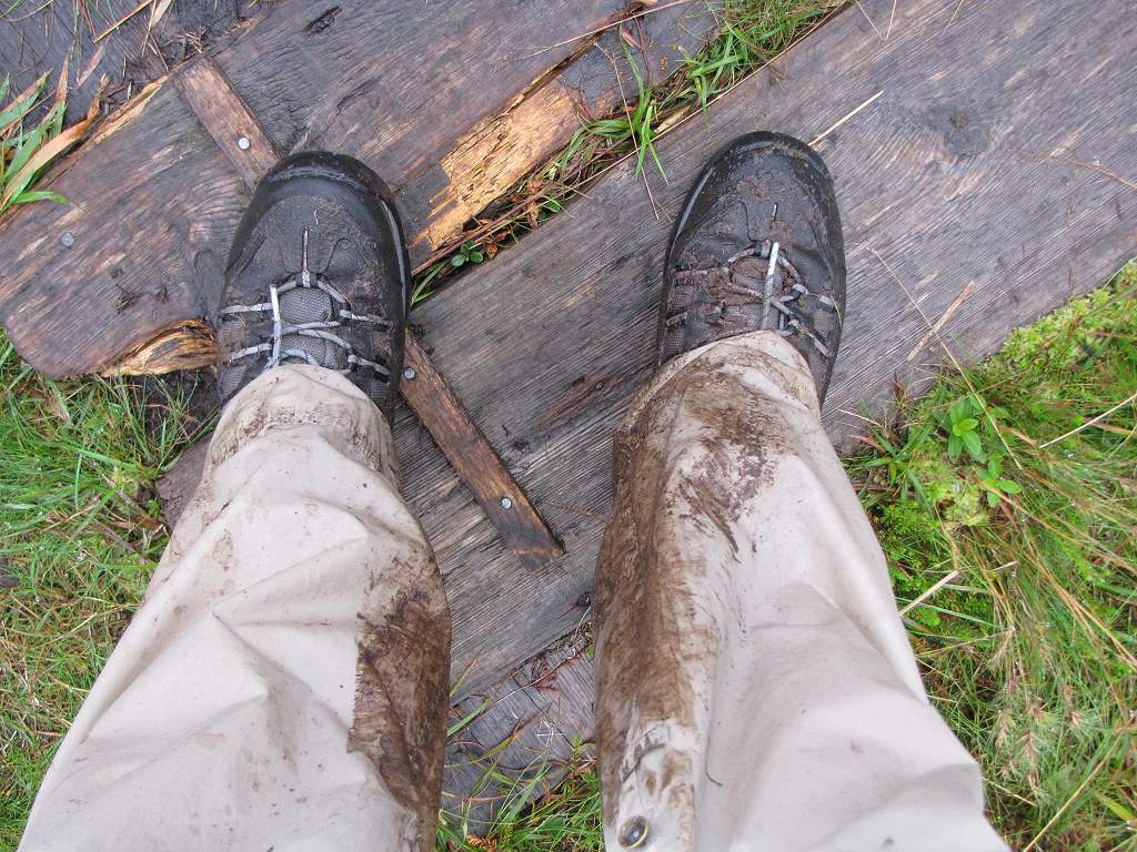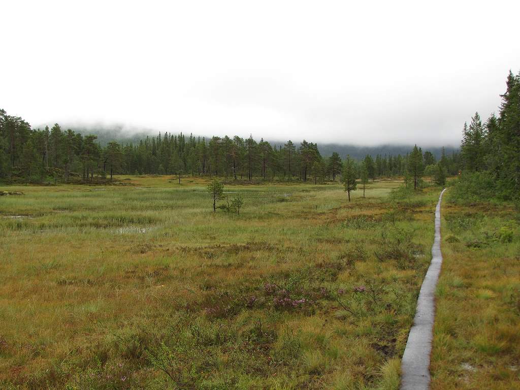 Es regnet die ganze Nacht, aber als wir losgehen wollen, hört der Regen auf und lässt uns trockenen Hauptes bis zum Mittelpunkt marschieren. Zehn Kilometer ist der Wanderweg lang. Der erste Kilometer ist ein gewöhnlicher breiter Weg über Wurzeln und Steine. Die letzten neun Kilometer führen durch eine Art Hochmoor. Um dieses zu überwinden, läuft man auf einem extra ausgelegten Weg, bestehend aus Holzbohlen. Das bedeutet, dass man neun Kilometer auf einem schmalen Steg unterwegs ist und nur hintereinander laufen kann. Rutschig ist es auf Grund der Feuchtigkeit jedoch nicht, da die Holzbohlen sogar mit einem Teerstreifen (wie man es von Dachdeckerarbeiten kennt) beschlagen sind. Zudem ist nach jedem Kilometer ein Holzschild in den Sumpf gesteckt, dass einem die Entfernung mitteilt. Es wird einem also wirklich leicht gemacht. Nur die 20 Kilometer Gesamtlänge muss man halt selbst überwinden. Am Mittelpunkt angekommen, machen wir natürlich das obligatorische Pingu-Foto und hören, nicht weit von uns entfernt, Hundegebell und Stimmen. Es sind die ersten menschlichen Geräusche, die wir seit gestern Nachmittag hören. Und das mitten in der Wildnis. Nach den Fotos geht es schlicht und einfach wieder kehrt marsch.