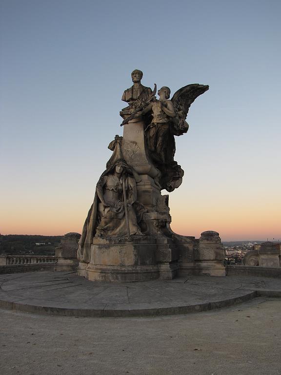 Vom Aussichtspunkt aus sind die einzelnen Elemente der Oberstadt gut zu erkennen. Es beginnt links mit dem südlichsten Abschnitt, der aus dem Château Baronnial besteht, gleichzeitig dem größten Bauwerk des Stadtkerns – auch wenn es sich nur noch um eine Ruine handelt. Rechts davon, also nördlich, erkennt man das erste Gebäude mit einem Dach. Es handelt sich um den Donjon des Château d’Harcourt. Nicht zu sehen ist der Überrest der dritten Burg, dem Château de Montléon, welches sich dahinter verbirgt. Unübersehbar ist jedoch rechts neben dem Château d’Harcourt der Turm der Stiftskirche Saint-Pierre. Gleich daneben, als nördlichster Punkt erhebt sich der mächtige Donjon des Château de Gouzon, der mit seiner fensterlosen Front beinahe wie ein mächtiger Hochbunker wirkt.