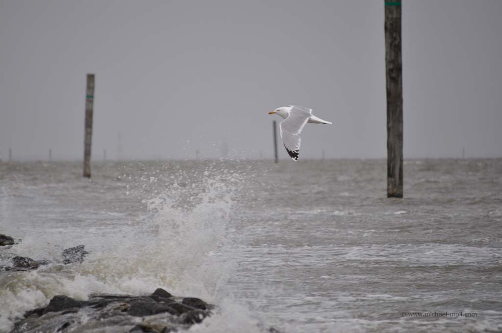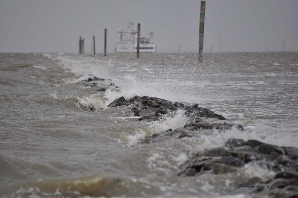 Nach einem Nachmittagsspaziergang entschlossen wir uns, zur Sicherheit das Auto umzustellen. Es war abzusehen, dass die Flut kam und diese höher ausfiel als üblich. Der Wind, der vom Meer kam, trieb das Wasser weiter in das Hafenbecken als normal, so dass der Stellplatz innerhalb weniger Minuten teilweise unter Wasser stand. Vorgewarnt war man aber auch durch den Platzbetreiber, der auf die Gefahr aufmerksam machte.