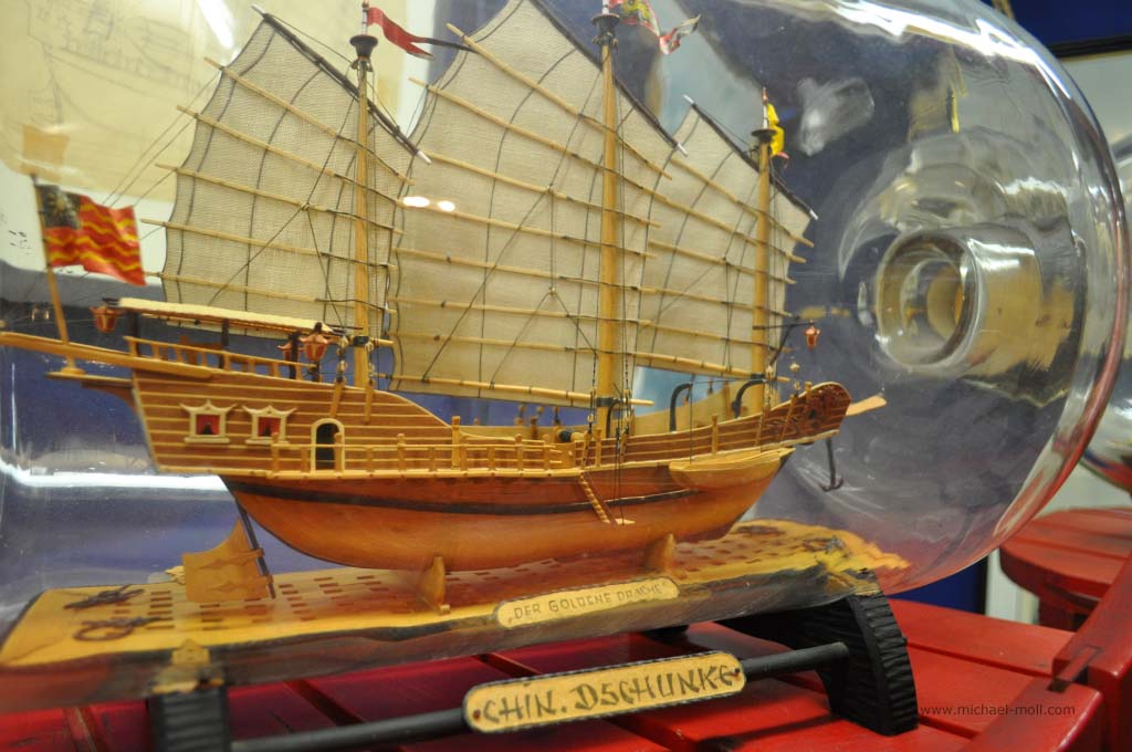Dafür wanderten wir an einem der Tage über den frisch gemähten Deich nach Neuharlingersiel (Track). Unser GPS-Logger verriet uns später, dass es sich um eine Strecke von 7,6 Kilometern handelt, die wir mal eben hin und zurück gingen, nur um in Neuharlingersiel das dortige Buddelschiffmuseum zu besichtigen. Die kleine Ausstellung zeigt zahlreiche Schiffe, die irgendwie in Flaschen jeglicher Größe einzwängt wurden. Bei nicht wenigen Schiffen fragt man sich, wie man diese in die Buddel bekommen hat.