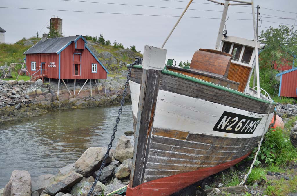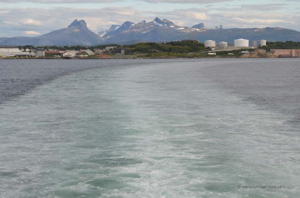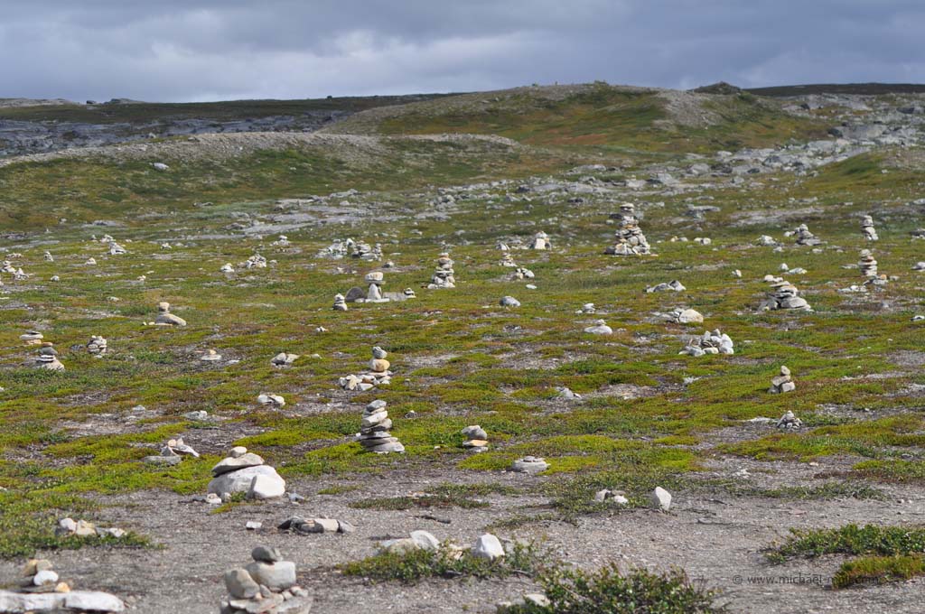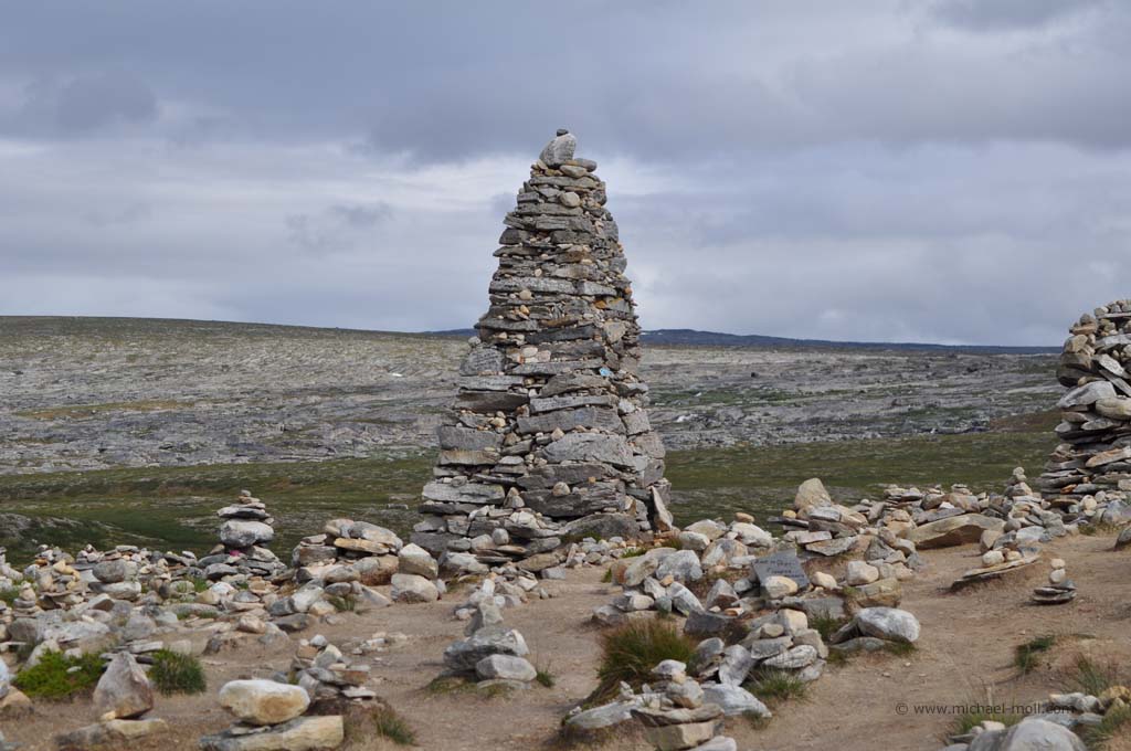 Es roch nicht nur gut, sondern es war auch ein richtiger Handwerksbetrieb und man konnte dem Bäckerpärchen bei seiner Arbeit am Steinofen zu schauen. Kein Wunder, dass der Laden gut besucht war und wir uns dort auch verköstigten. Wir verließen Å auf der E 10 und waren verwundert, dass es hier – so weit abseits gelegen – eine Europastraße gibt. Wir schauten uns den kleinen Ort Reine an, doch auch hier ließ uns das Wetter schnell weiter ziehen. Immerhin sah er nicht viel anders aus als Å. Witzigerweise sah ich hier aber Trockenfisch, der nicht nur in den typischen Anlagen aufgehängt wurde, sondern auch ganz normalen, herkömmlichen Wäschespinnen im Vorgarten. Einen Fjord schauten wir uns auch noch an, der im Zweiten Weltkrieg eine Rolle spielte. Es gab zwar einen Wanderweg, aber das Wetter – es wollte einfach nicht besser werden. So beließen wir es bei der Besichtigung eines Denkmals und machten uns auf, eine sogenannte Kulturlandschaft zu besichtigen. Die Skulptur Eptiaph wurde vom japanischen Künstler Toshikatsu Endo 1988 errichtet und bestand aus einem großen Zylinder, der wiederum aus einfachen Steinen gebaut wurde. Ich bin einmal herum gegangen und habe versucht, den Sinn zu verstehen, aber vergeblich. Interessanter fand ich dahingegen dann doch den Sandstrand. Durch das miese Wetter leuchtete das Wasser türkisgrün und der Strand bestand aus feinstem Sand. Wäre das Wetter besser, würde kein Mensch bemerken, dass wir uns hier nördlich des Polarkreises befanden.