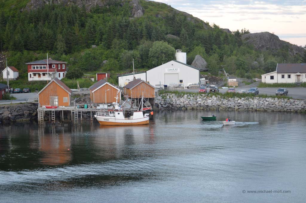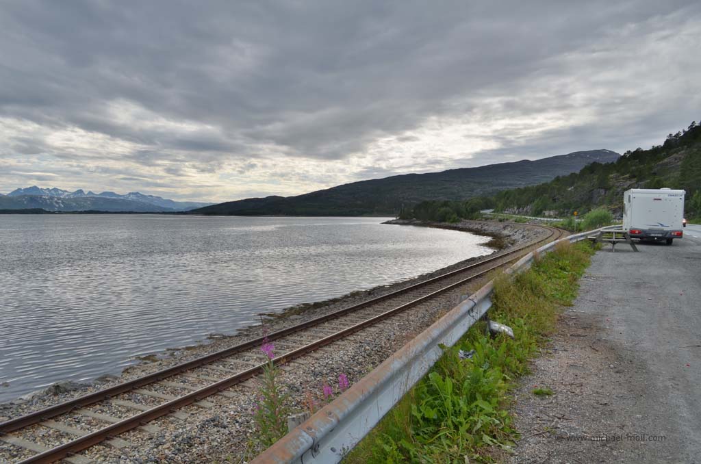 Hinter Bøstad folgte ein Wikingermuseum. Aber das interessierte uns weniger. Wir schauten uns lieber die Kirche dahinter an. Sie stand auf einem Platz, an dem im Zweiten Weltkrieg 600 sowjetische Kriegsgefangene festgehalten wurden. Immer wieder erschreckend, bis wohin der Krieg seine Ausmaße hatte. Zwischen den Insel Gimsøya und Austvågøya überquert man die Nordsee auf einer Brücke. Gleich dahinter gibt es einen Rastplatz. Doch leider ist auch hier das Übernachten verboten. Also fuhren wir nach kurzer Beratschlagung weiter. Und weit mussten wir gar nicht mehr fahren, denn schon nach wenigen Kilometern lockte ein Schild zu einem Wohnmobilstellplatz direkt neben der Straße und mit Zugang zum Meer und zum W-Lan. Und das zu einem extrem günstigen Preis. Da es schon spät war und wir auf besseres Wetter am nächsten Tag hofften, quartierten wir uns dort natürlich ein. Ein selbstgebasteltes Schild zeigte uns, dass das Nordkap noch 1.060 km entfernt ist. Nach Hammerfest sind es „nur“ noch 797 Kilometer. Na dann…