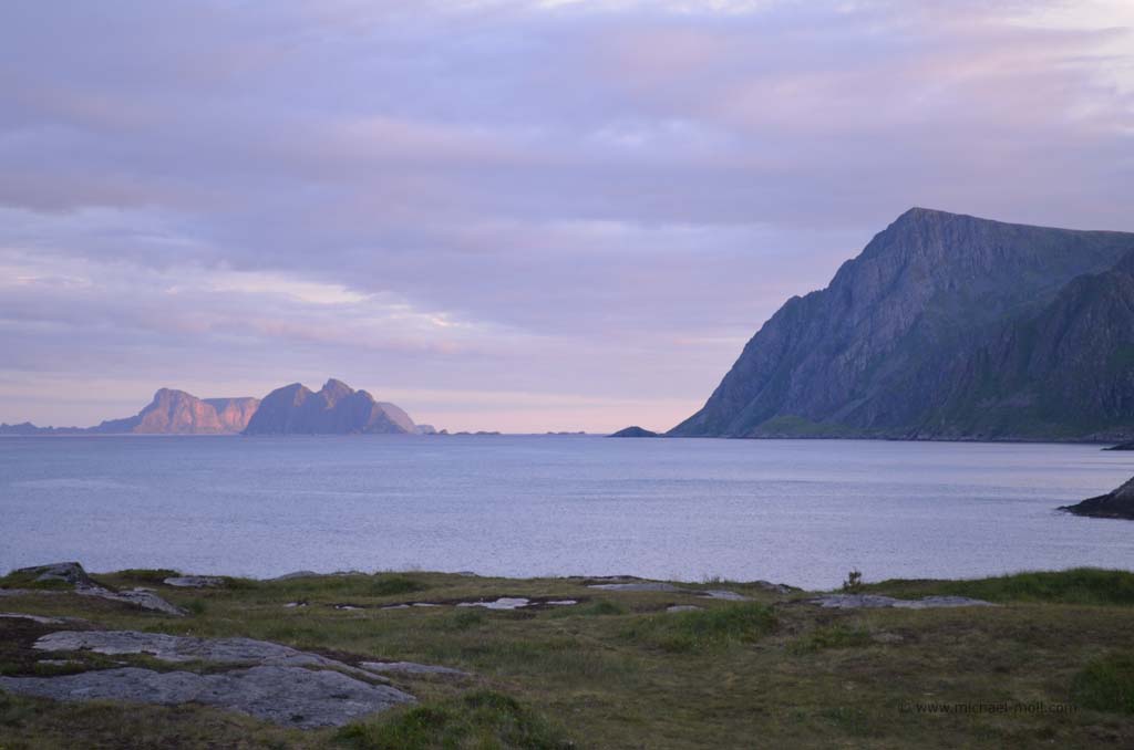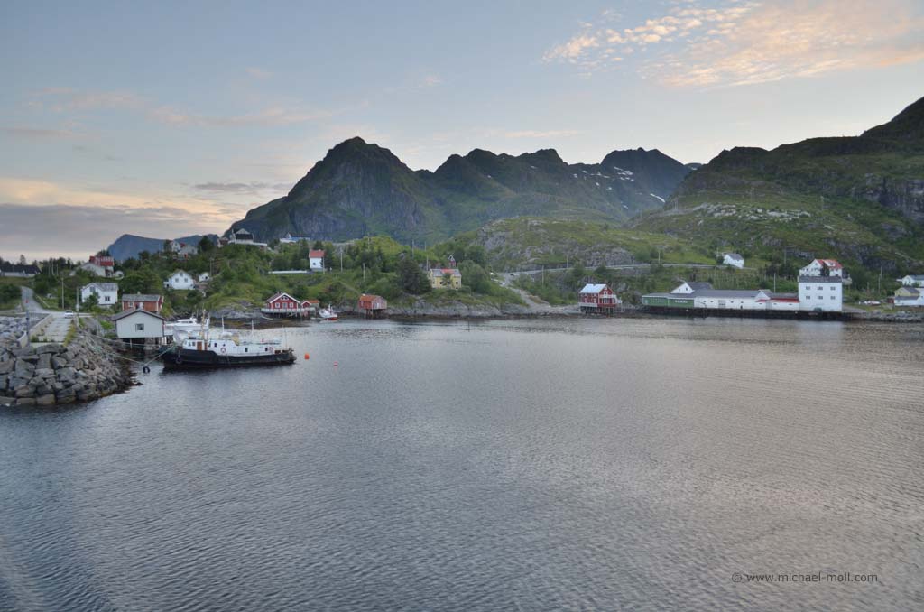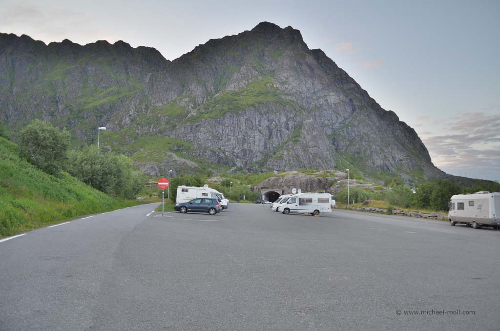Spät abends kamen wir in Moskenes an und es dämmerte schon. Wir hatten keine Ahnung, wo wir übernachten konnten. Eigentlich hofften wir auf einen Parkplatz am Hafen, aber weit gefehlt. Da ging nichts. Also fuhren wir weiter in Richtung Ende der Lofoten. In die andere Richtung wollte ich nicht, da ich nicht Gefahr laufen wollte, an zahlreichen schönen Orten vorbei zu fahren und am nächsten Tag keine Lust zu haben, wieder die Strecke zurück zu fahren. Ich dachte mir, am Ende einer Inselgruppe muss es doch einen Parkplatz geben. Und so war es dann auch. Wir durchquerten den kleinen, eng bebauten Ort mit dem äußerst kurzen Namen Å und einen Tunnel. Gleich dahinter war dann der erhoffte Parkplatz. Umgeben von Schären, Felsen und einigen Wohnhäusern. Aber wir waren nicht alleine auf diesem Parkplatz. Wir stellten das Auto ab und gingen noch eine kleine Runde herum. Hell genug war es ja noch, um wenigstens etwas zu sehen, obwohl es bereits kurz vor 23 Uhr war.