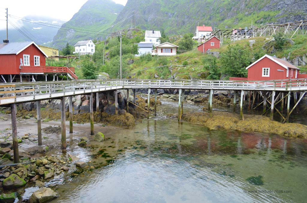 Nach dem Aufstehen machten wir uns zunächst auf, den Ort zu besichtigen. Wir schlenderten zwischen den roten Holzhäusern hindurch, genossen die Meeresluft und waren ein wenig über das schlechte Wetter enttäuscht. Am Tag zuvor sah es so gut aus, als wir ankamen, doch heute waren die Berge hinter dichten Wolken verschwunden. Aber so kann das wohl gehen, auf den Lofoten. Das Trockenfischmuseum sparten wir uns, sahen aber zahlreichen Trockenfisch außen hängen. Irgendwie wirkte es wie in einem Gruselfilm. Mit einem weit aufgerissenen Mund hängt der Fisch da rum und scheint einen anzugaffen. Interessant war auch die kleine Bäckerei in Å.
