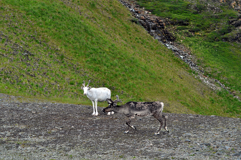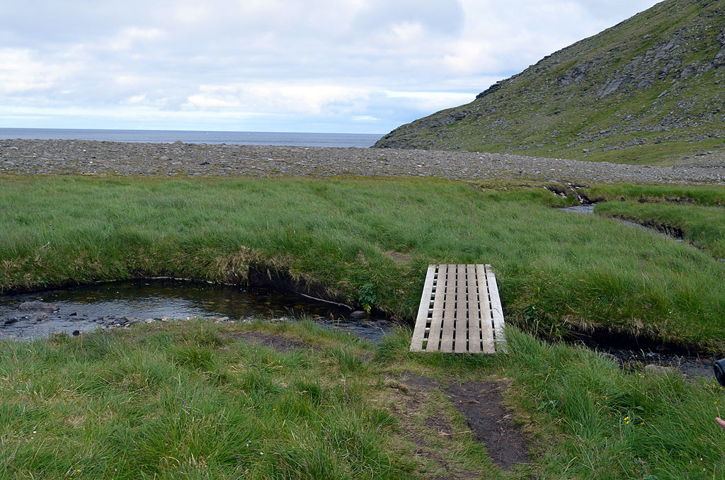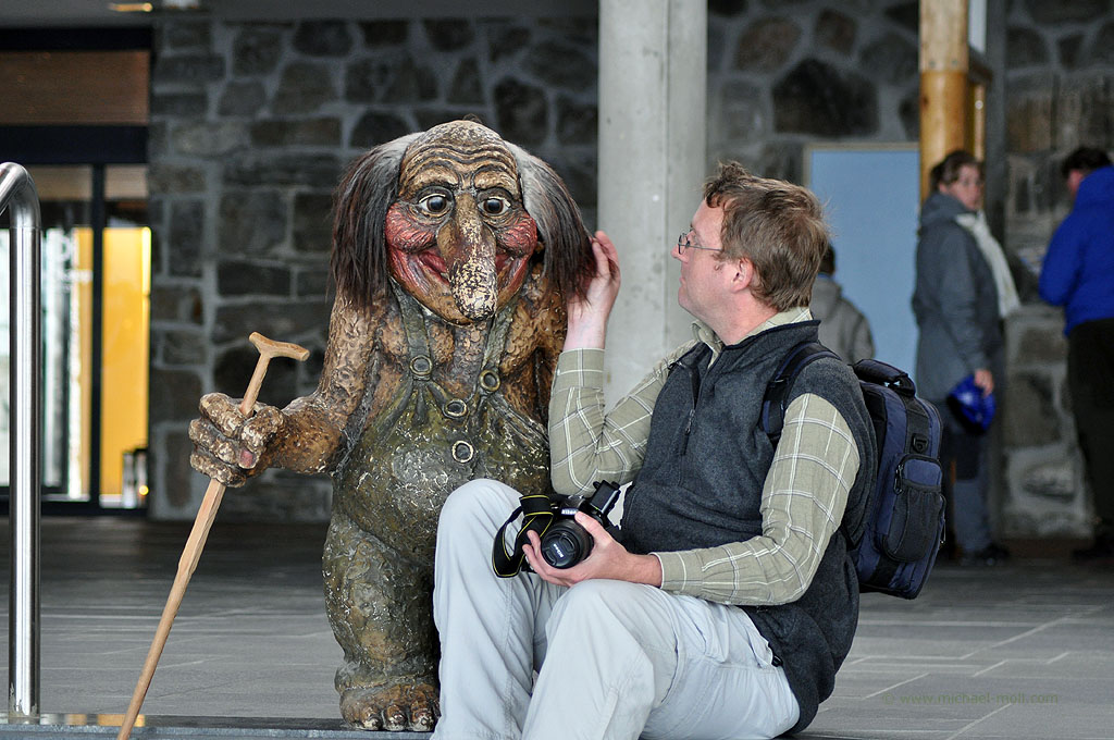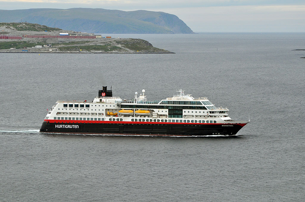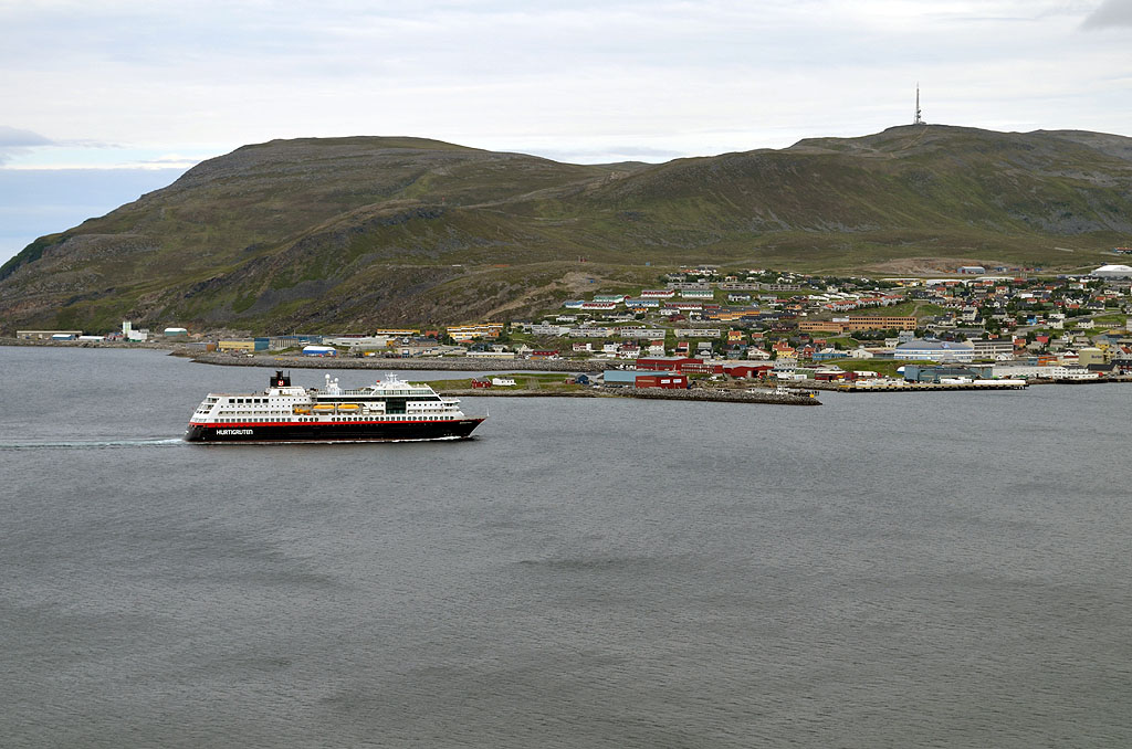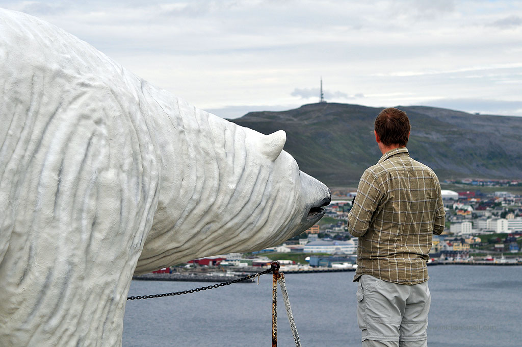 Morgens schauten wir uns Honningsvåg an und sahen, wie ein Schiff der Hurtigruten anlegte. Die Passagiere kamen von Bord und gingen zielstrebig auf bereit stehende Busse zu. Überwiegend waren es Deutsche und sie freuten sich natürlich, hier zu sein. Ich konnte es ihnen nicht verübeln. Trotzdem taten sie mir ein wenig leid, denn ich wusste bereits, wie ein Landgang zum Nordkap aussah. Schnell, hetzen und dann wieder zurück zum Schiff. Nein, ich wollte zwar gerne wieder zum Nordkap, aber getauscht hätte ich in diesem Moment dann auch wieder nicht. Wir holten unsere Urkunden ab, weil wir gestern zum Knivskjellodden gewandert sind und dann lasen wir noch etwas über den Marinehund Bamse. Eine außergewöhnliche Geschichte über einen Bernhardiner, der dem Hafenmeister von Honningsvåg gehörte. Er trug eine Matrosenmütze und einen Matrosenkragen und war im Zweiten Weltkrieg auf einer Weihnachtspostkarte zu sehen, die an Norweger in der ganzen Welt verschickt wurde. Bamse wurde Schiffshund der Marine und erhielt nach seinem Tod ein Begräbnis mit vollen militärischen Ehren, zu dem 800 Menschen kamen. 1984 und 2006 erhielt der Hund posthum zwei Orden. Einfach nur weil er ein Hund war, der den Leuten im Krieg ein wenig Freude bereitete. Im Hafen von Honningsvåg befindet sich heute eine Statue des Hundes.