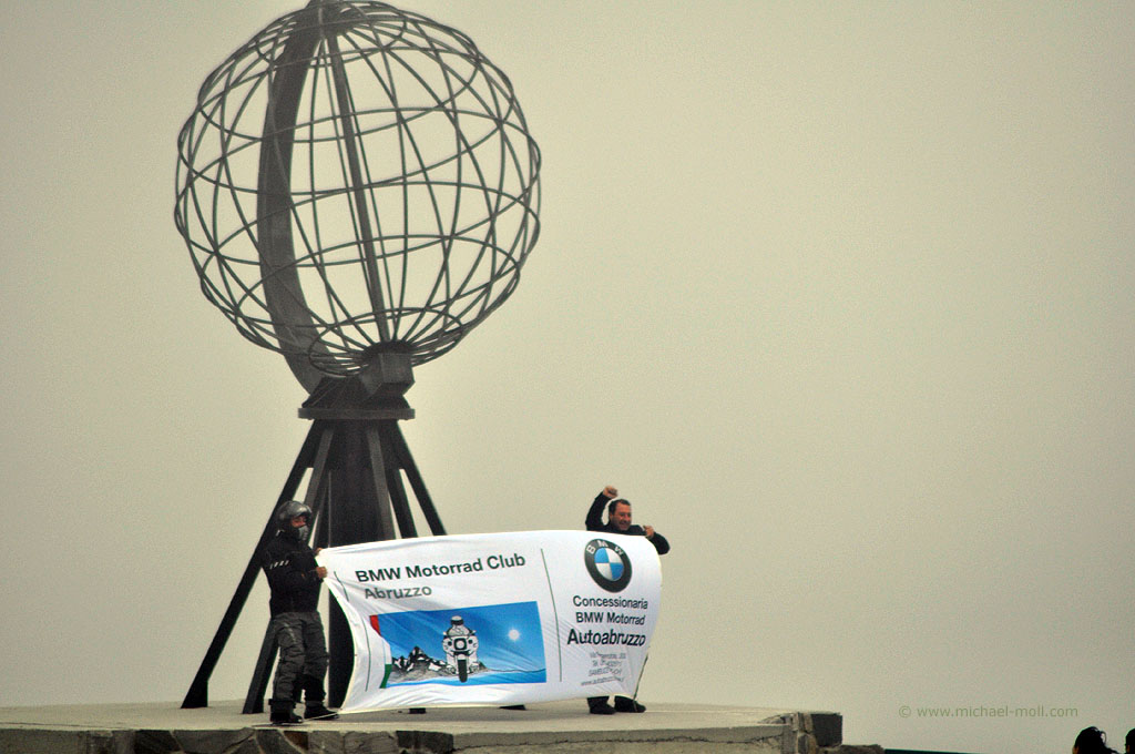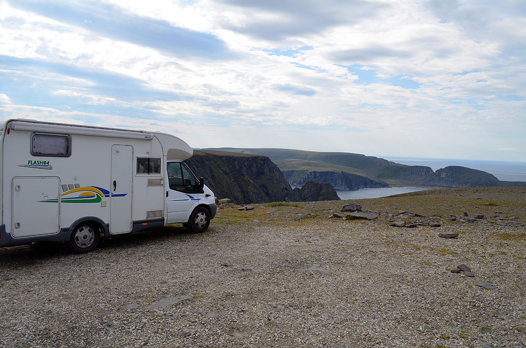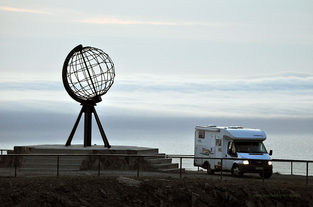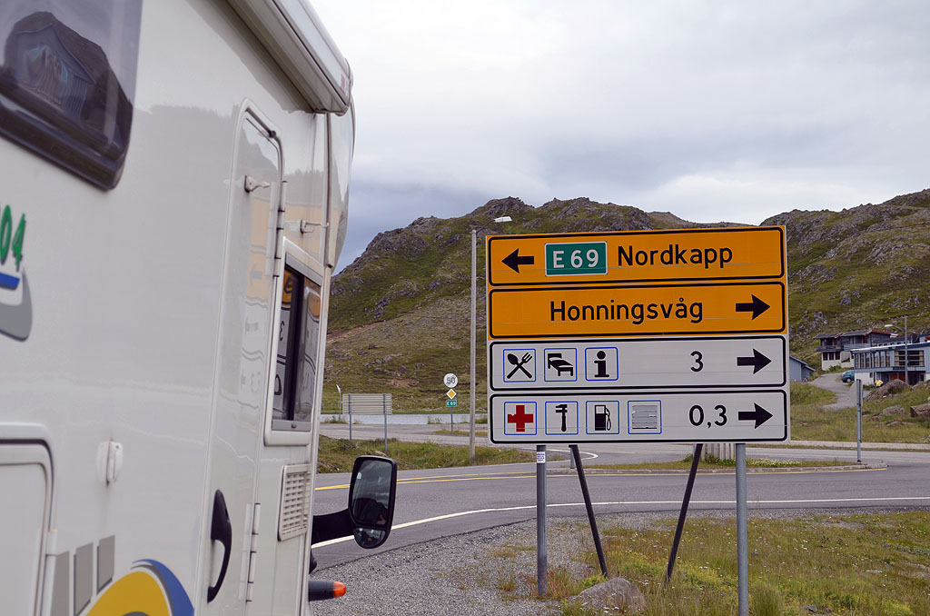 Ganz ohne Hupen fuhren wir weiter und erreichten nach weiteren Begegnungen mit Rentieren und Fotostopps den Abzweig bei Honningsvåg, wo es links zum Nordkapp geht. Wir beschlossen, die Stadt später zu besichtigen. So kurz vor dem Ziel wollten wir einfach nicht mehr abwarten. Unser Navi zeigte noch 300 Meter an, als wir an der Schranke vor dem Parkplatz ankamen. 48 Stunden dürften wir nun hier parken und alles besichtigen, nachdem wir den Eintritt bezahlt hatten. Die Schranke öffnete sich und wir rollten unseren Wagen auf den großen Schotterparkplatz mit Aussicht auf das Polarmeer. Wir waren da. Wir haben es geschafft und das Nordkap mit dem Wohnmobil erreicht. Eine große Leistung ist das natürlich nicht. Es ist ja keine Expedition, so wie es manche noch verkaufen möchten. Man folgt einfach der gut ausgebauten Straße bis zum nördlichsten Punkt und schon ist man angekommen. Ich hatte den Besuch des Nordkaps bereits im Blog beschrieben und das in drei Teile gefasst, weshalb ich hier nicht so viel notieren möchte. Aber zusammengefasst: Wir waren begeistert. Wir wurden Mitglied im Royal North Cape Club und wir blieben beinahe die kompletten 48 Stunden. Außerdem ist uns klar, dass wir auf jeden Fall wieder kommen werden. Warum auch nicht? Beim nächsten Mal müssen wir keinen Eintritt zahlen, weil wir ja zu den Mitgliedern zählen. Wieder so eine Art Eliteclub 😉
