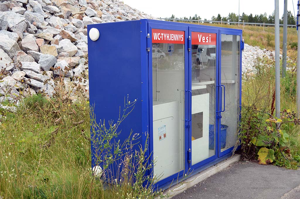Nach unserem Stadtrundgang fuhren wir in Richtung Turku. Unser Ziel sollten nämlich die Åland-Inseln sein. Auf einem Autobahnrastplatz machten wir zunächst Halt. Und nun passierte etwas Seltsames. Es handelte sich um einen großen, leeren Parkplatz, etwas unterhalb der Tankstelle. Vier Parkplätze waren sogar extra für Wohnmobile vorgesehen und es gab auch eine Entsorgungsstation. Also blieben wir zunächst. Doch mit Einsetzen der Dunkelheit wurde es plötzlich unheimlich. Auf einmal gefiel es mir nicht mehr, dass ich zwei Parkplätze neben mir sehen konnte, wie dort Scheibensplitter von einem Autoeinbruch zeugten.