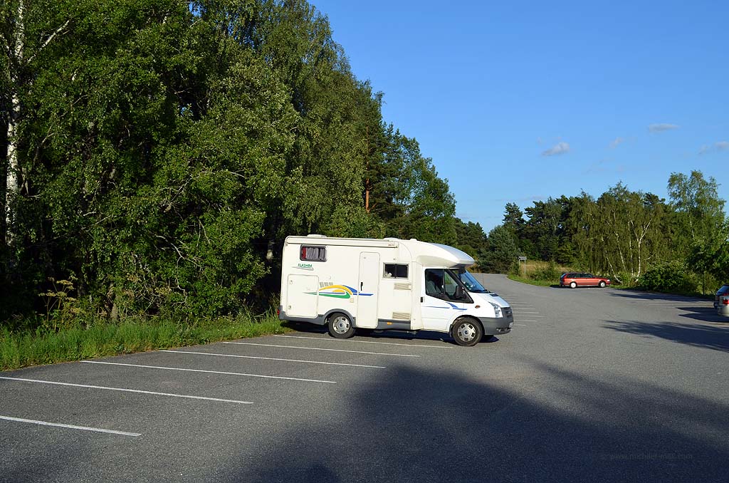 Leicht verärgert fuhren wir zur Küste westlich von Turku, setzten uns auf die Schären und genossen den Samstagnachmittag mit einem entspannten Blick auf die Ostsee. Aber unruhig wie wir nun mal sind, konnten wir es nicht lange dabei belassen. Also fuhren wir nach Naantali, sahen das angesprochene Mumin-Land, entdeckten ein Schild für den finnischen Teil des Jakobswegs und schlenderten zwischen den Holzhäusern hindurch. Abends wussten wir noch nicht, wo wir nächtigen sollten. Weit weg vom Fährterminal sollte es nicht sein, da das Schiff sehr früh auslaufen würde. Also fuhren wir nach Turku zurück und schauten uns dort noch ein wenig um. Aber in der Stadt gab es keine vernünftige Stellmöglichkeit und am Terminal war es verboten. Wir fanden einen schönen, ruhigen Parkplatz auf der Halbinsel Ruissalo. Für eine gute halbe Stunde wurden wir noch Zeugen, wie man in einem Pkw kleine finnische Kinder zeugt, aber das war es dann auch schon.