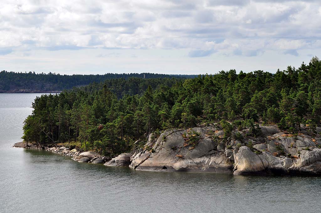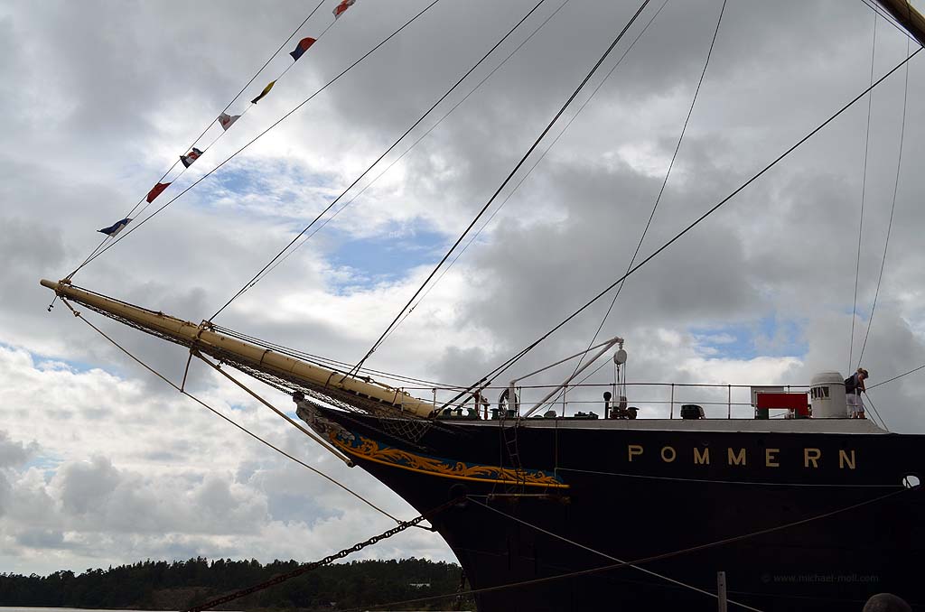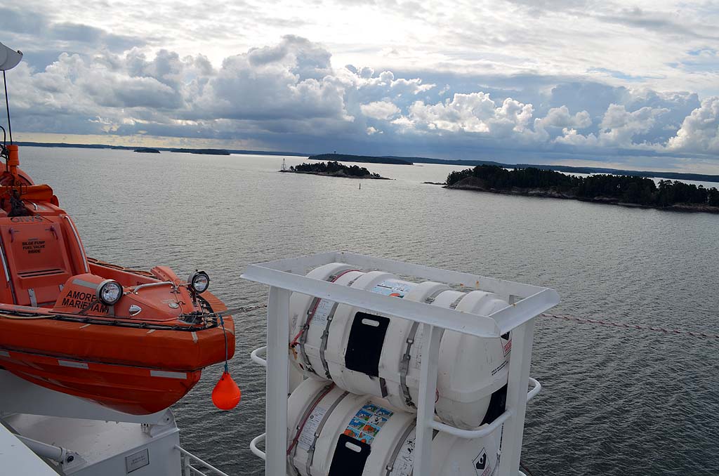 Die Fähre nach Mariehamn auf den Åland-Inseln sollte schon früh ablegen. Daher riss uns der Wecker aus dem gemütlichen Schlaf und wir fuhren schnell die sieben Kilometer bis zum Hafen in Turku. Dort hieß es natürlich warten auf das Einfahren. Wir waren einer der letzten, die auf das Schiff durften, aber Hauptsache, wir waren überhaupt drauf. Denn noch einen Tag bei Turku wollte ich nicht unbedingt verbringen. Auf dem Schiff gab es eine nette Uhr mit zwei Zeigern für die Stunde. Eine für die schwedische und eine für die finnische Zeit. Kein Wunder, denn Mariehamn ist für das Schiff nur eine Zwischenstation. Anschließend wird es weiter nach Schweden fahren. So weit wollten wir aber noch nicht. Die Ostsee war relativ ruhig, trotzdem unterquerten wir eine ziemlich dunkle Wolkendecke. Hierbei konnte ich beobachten, wie sich mehrere kleine Rüssel aus den Wolken herausbildeten und nach unten zogen. Es wirkte natürlich unheimlich und irgendwann traf einer der Rüssel die Oberfläche der Ostsee. Siehe da, plötzlich konnte ich einen kleinen Tornado sehen. Oder war es eine Wasserhose? Ich weiß es nicht. Aber es war schon beeindruckend.