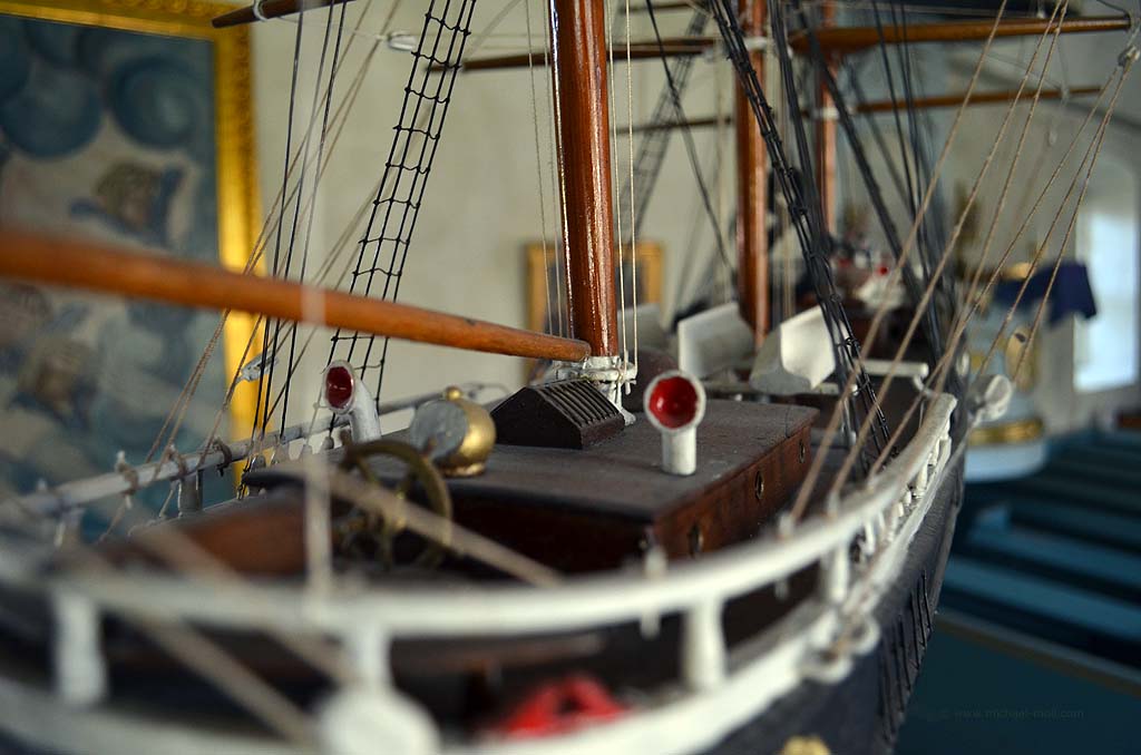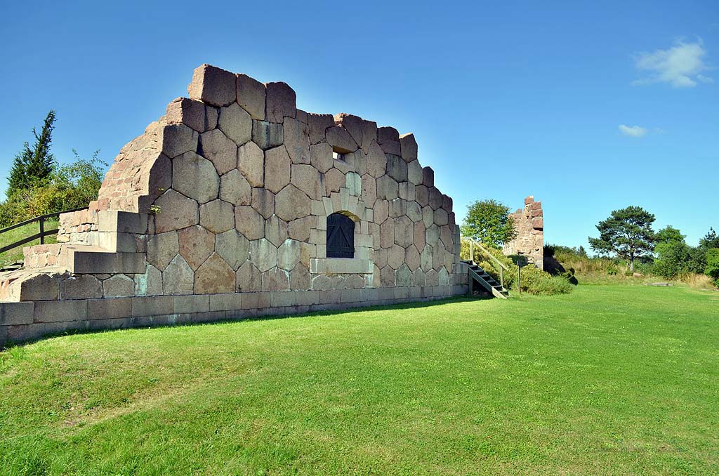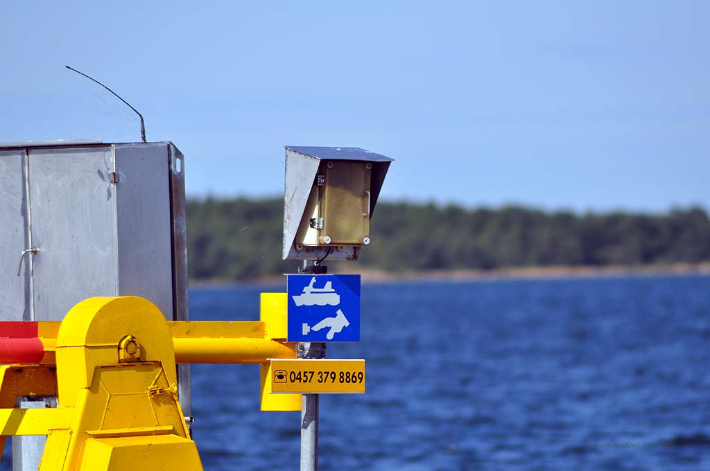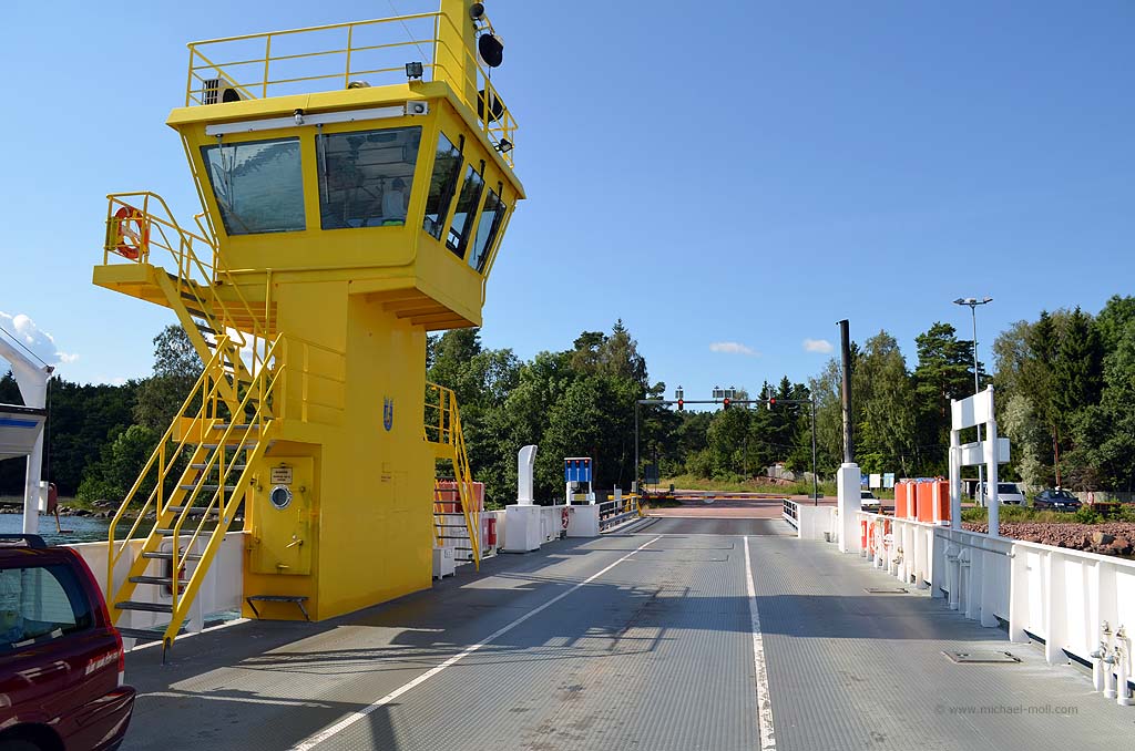 Bei strahlend blauem Himmel genossen wir die kleine Tour und lernten dabei fast die gesamte Insel kennen. Am Ende der Tour wartete noch das kleine Museum auf uns, in dem eine nette Dame ausführlich über die Geschichte der gegenüber liegenden Festungsruine berichtete und uns ein Video davon zeigte. Wir hinterließen eine Spende und bedankten uns für die freundliche Beschreibung und für die Bemühungen. Diese Festung Bomarsund muss unglaublich groß gewesen sein und hatte Mitte des 19. Jahrhunderts Bestand. Heute kann man noch einige Mauerreste gut erkennen. Von Prästö fuhren wir weiter zur Insel Mickelsö. Hierfür wird eine Fähre benötigt, die kostenlos ist und bei Bedarf herangerufen werden kann. Diese Seilfähre pendelt aber auch automatisch. Der Klingelknopf wird vielleicht im Notfall oder während der Nachtstunden benötigt? Obwohl ich nicht den Eindruck hatte, dass nachts jemand auf den Straßen dieser Inseln unterwegs wäre.