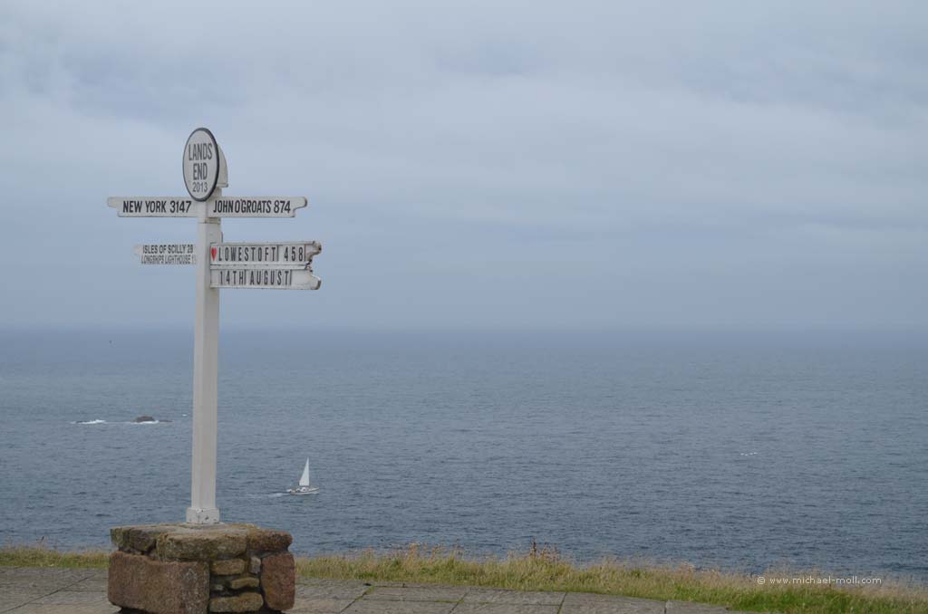 Die Nacht war nicht besonders ruhig, da wir die nahe gelegene Autobahn deutlich hörten. Das war für uns auf dieser Reise ungewohnt, wo wir doch so viele extrem ruhige Nächte verbrachten. Nach dem Aufstehen fuhren wir bereits sehr früh los, da wir heute noch eine weite Strecke vor uns hatten. Auf der Autobahn passierten wir Exeter und verschoben den Besuch der Stadt auf einen anderen Zeitpunkt. Wir lernten Devon also nur von der Autobahn aus kennen und erreichten bald die Grafschaft Cornwall. Doch erst die natürliche Begebenheit, dass die Insel endet, brachte uns zum Stehen. Wir waren am Ende der Halbinsel angekommen, die zu Recht den Namen Land’s End trägt. Der Parkplatz kostet 5 Pfund, aber anders als in Blackpool war ich hier gerne bereit, den Betrag auszugeben. Ganz davon abgesehen würde man für diese fünf Pfund sieben Tage lang immer wieder den Parkplatz befahren dürfen. Wer also in der Region Urlaub macht, wird so auf seine Kosten kommen.