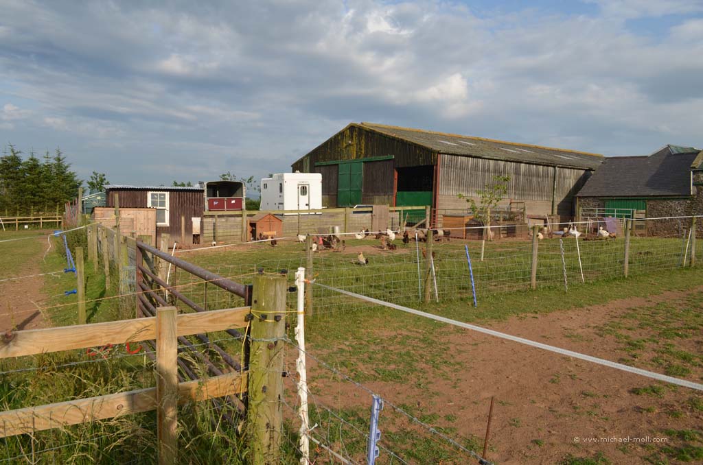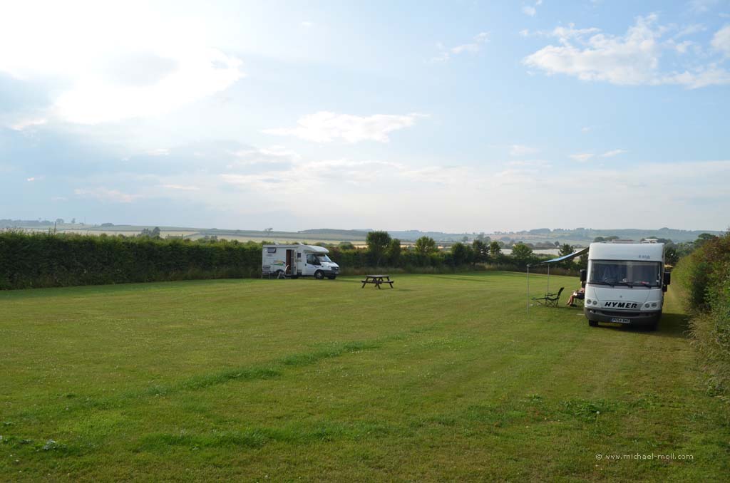 Ganz zur Not wären auf dem Weg später auch noch Campingplätze anzutreffen. Aber ganz so teuer wollten wir es heute nicht mehr haben. Bei Reston kamen wir dann zu einem kleinen Weiler, sahen das vertraute Campingclub-Schild und fuhren über das Hofgelände bis zu einem eingezäunten Bereich, der ganz offensichtlich für Wohnmobiltouristen angelegt wurde. Eine riesige Wiese mit einer hohen Ecke drumherum, die zu einer Seite offen war und einen tollen Ausblick gewährte. Bei einem britischen Wohnmobil, das dort schon stand, wurde gerade die Markise ausgerollt. Der Besitzer gab an, dass er auch gerade erst gekommen sei und zeigte uns das Haus, wo wir uns anmelden müssten. Gesagt, getan. Der ältere Farmer freute sich über unseren Besuch, genauso wie sein Hund Tippsy. Kurz gesagt: Wir fühlten uns willkommen. Außerdem war das Wetter schön, so dass wir die letzten Sonnenminuten noch vor dem Auto verbrachten und zu Abend aßen.