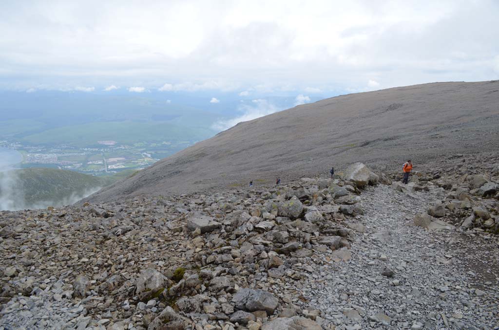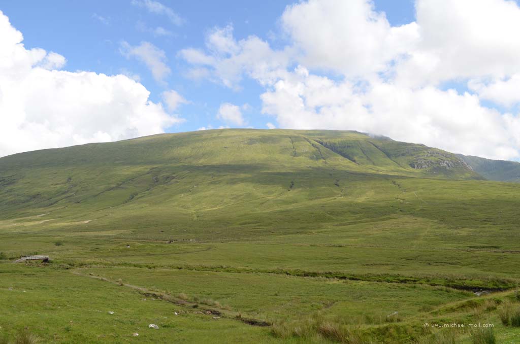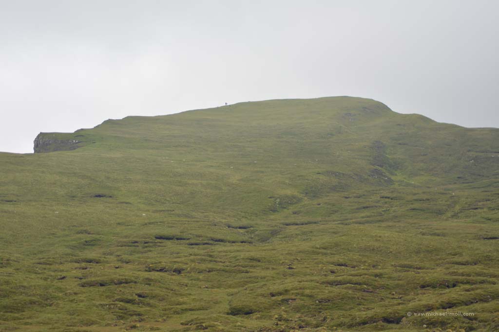 Auch diese Nacht war wieder sehr ruhig. Kein Lärm, keine Störung und keine Midges. Also starteten wir unseren zweiten Versuch, den Parkplatz vom Stac Pollaidh zu besuchen. Schnell fuhren wir die zehn Kilometer zurück, hielten an und schlüpften in unsere Wanderschuhe. Der Stac Pollaidh ist eigentlich gar nicht so hoch, aber eben markant. Ein einfacher, aber steiler Wanderweg führt einmal rund um den Berg und so war das die erste Bergumrundung, die ich je gemacht hatte. Auf den eigentlichen Gipfel kommt man jedoch nicht ganz so einfach. Da ist dann schon mehr Klettern angesagt, was aber nicht ganz ungefährlich ist, weswegen wir das lieber bleiben ließen. Ganze drei Stunden hielten wir uns Stac Pollaidh auf, um die 4,5 Kilometer ganz in Ruhe zurückzulegen. Das Wetter hatte an diesem Vormittag wunderbar mitgespielt, die Midges verhielten sich ruhig und so hatten wir eine wunderbare Wanderung mit tollen Aussichten und Fernblicken erlebt. Prädikat: Unbedingt empfehlenswert. Nach dieser Tour fuhren wir zurück zur A835, bogen rechts ab und durchquerten Ullapool, um kurze Zeit später zu den Measach-Wasserfällen zu gelangen.