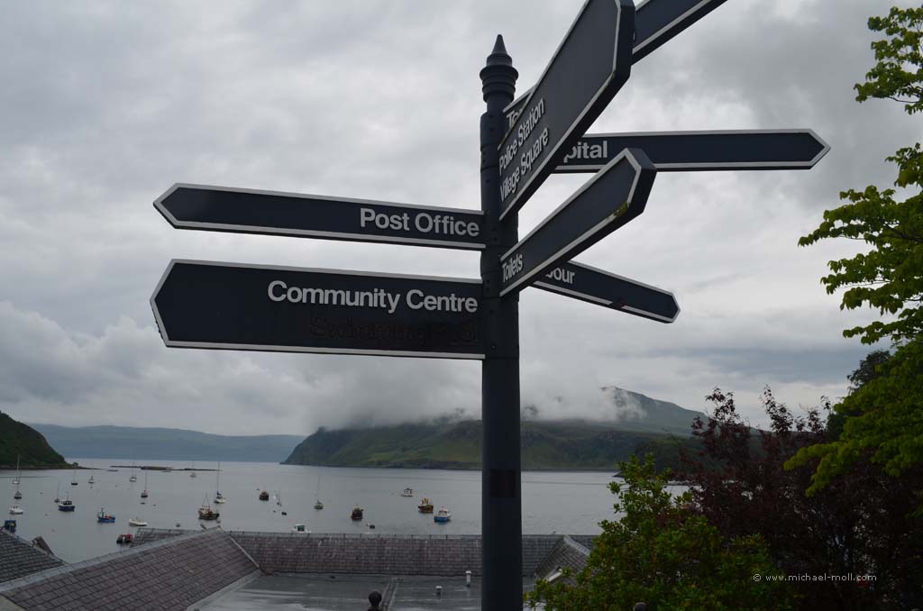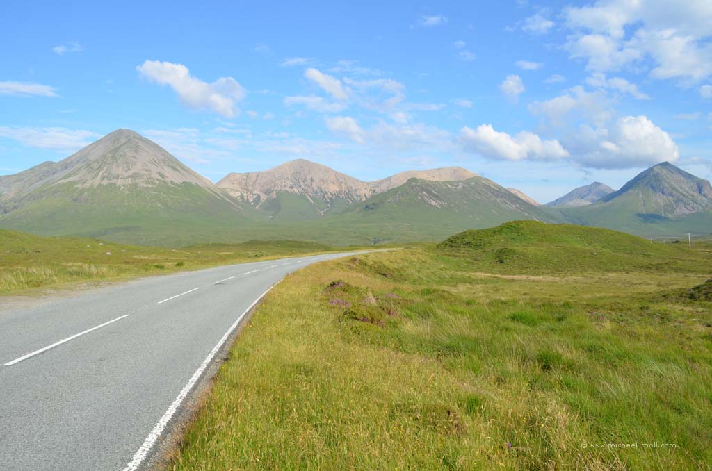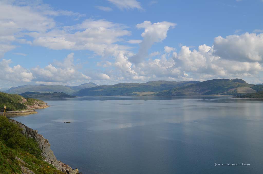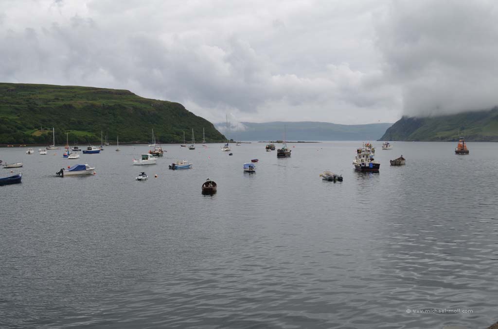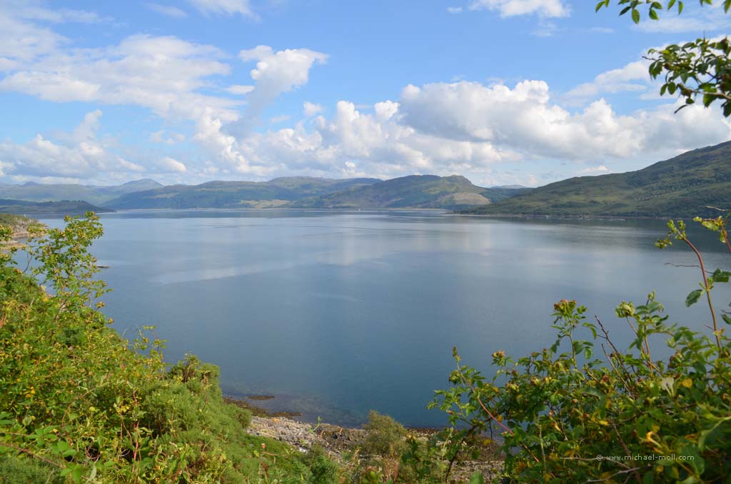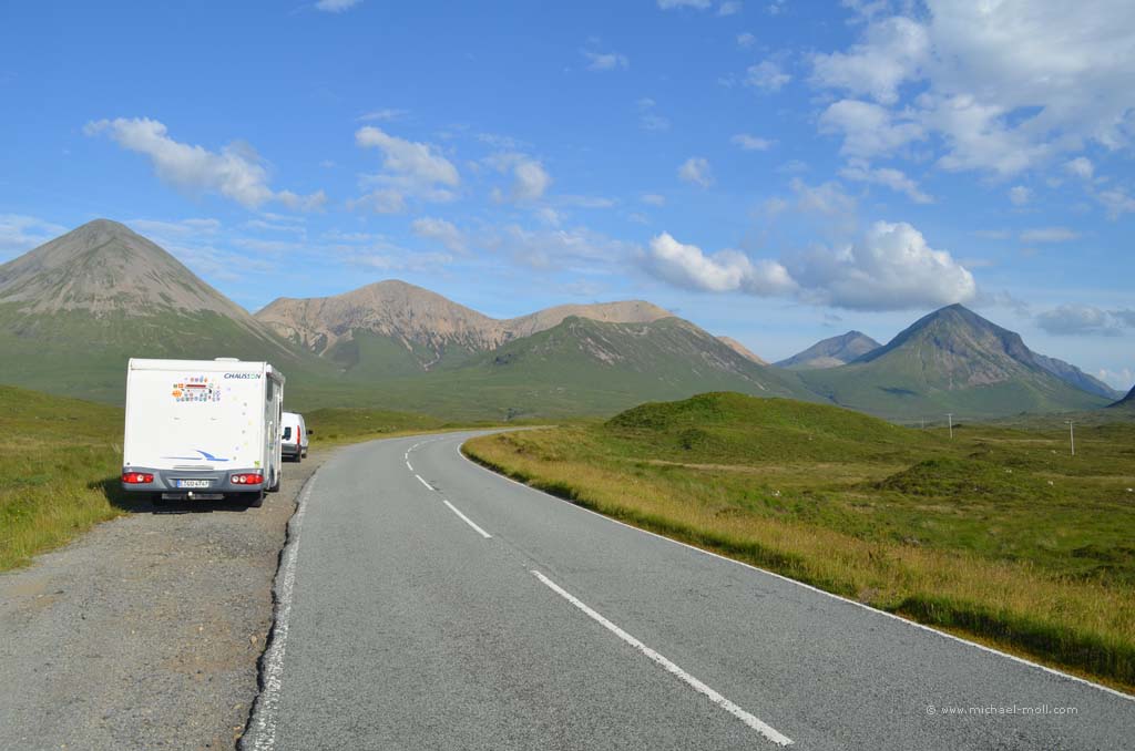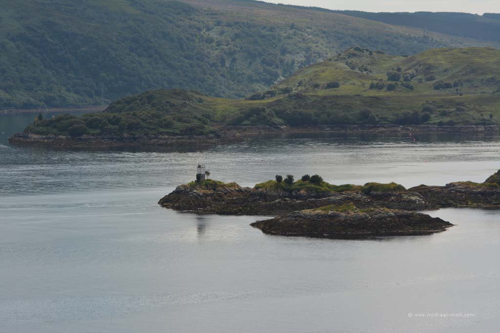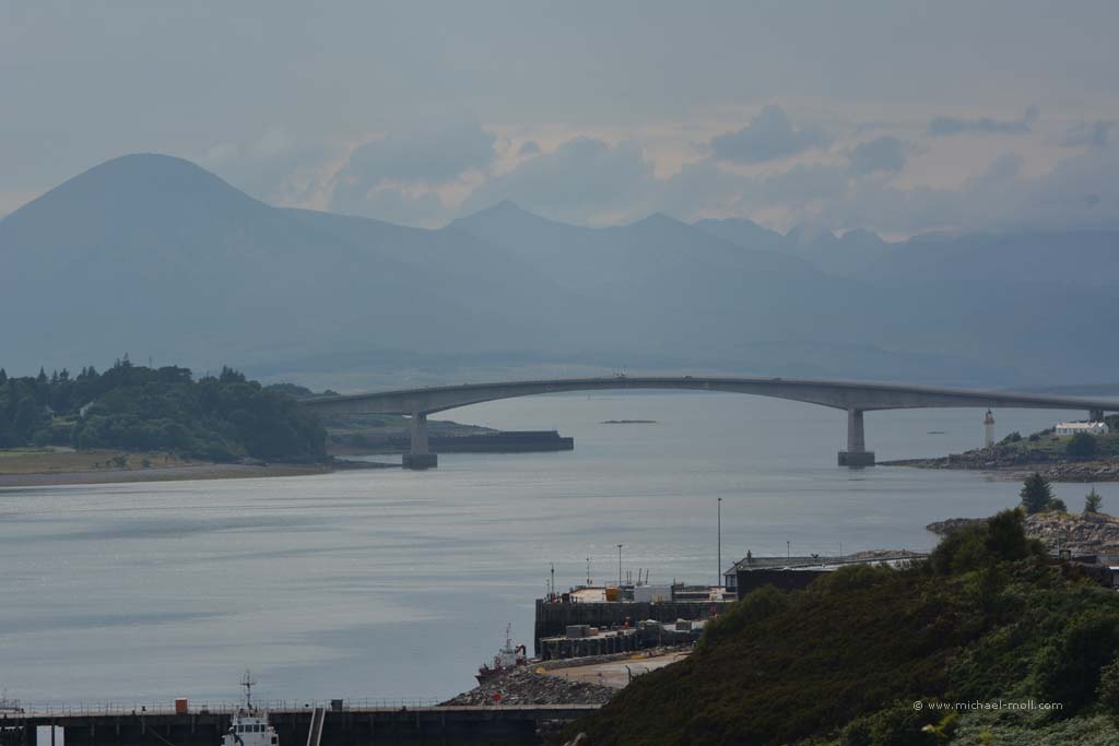 Der Fluss mündete in den gleichnamigen Loch Carron, wo sich die Straße deutlich verjüngte und stellenweise sehr eng wurde. Anschließen überquerten wir einen kleinen Höhenzug und bogen an der A87 nach rechts ab. In Kyle of Lochalsh endet die Zugstrecke, dafür begann dort für uns der Aufenthalt auf der Isle of Skye. Über die markante Skye Bridge und folgten der Straße bis Broadford, wo wir mal wieder tankten und einen Supermarkt aufsuchten.