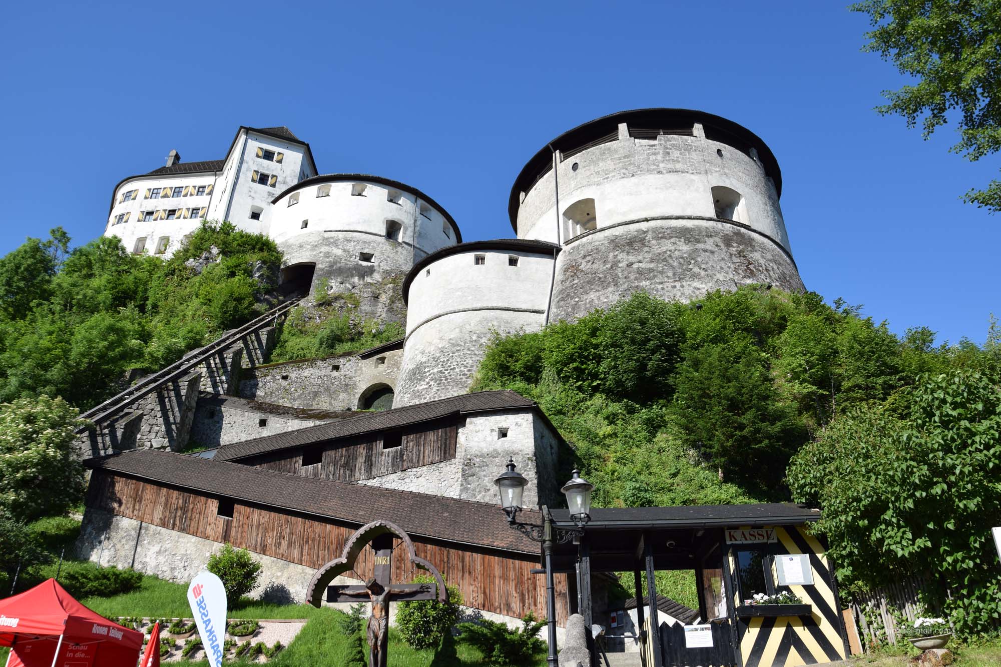 Am folgenden Morgen gingen wir schnell noch zu einer Bäckerei und dachten uns, wie gut es sei, dass man sich irgendwo auskennt. Bei strahlend blauem Himmel überquerten wir die Grenze zu Österreich und steuerten auf den Bahnhof von Kufstein zu, wo wir verabredet waren. Da wir noch viel zu früh dran waren, schlenderten wir ein kleines bisschen durch die kleine Innenstadt, besichtigten die Kufsteiner Burg von außen und freuten uns schon darauf, den Tag zu dritt verbringen zu können.