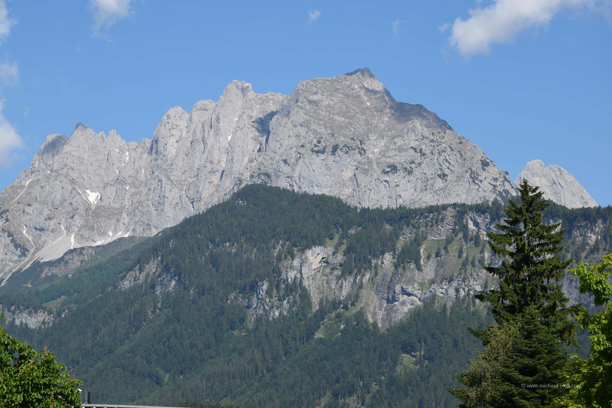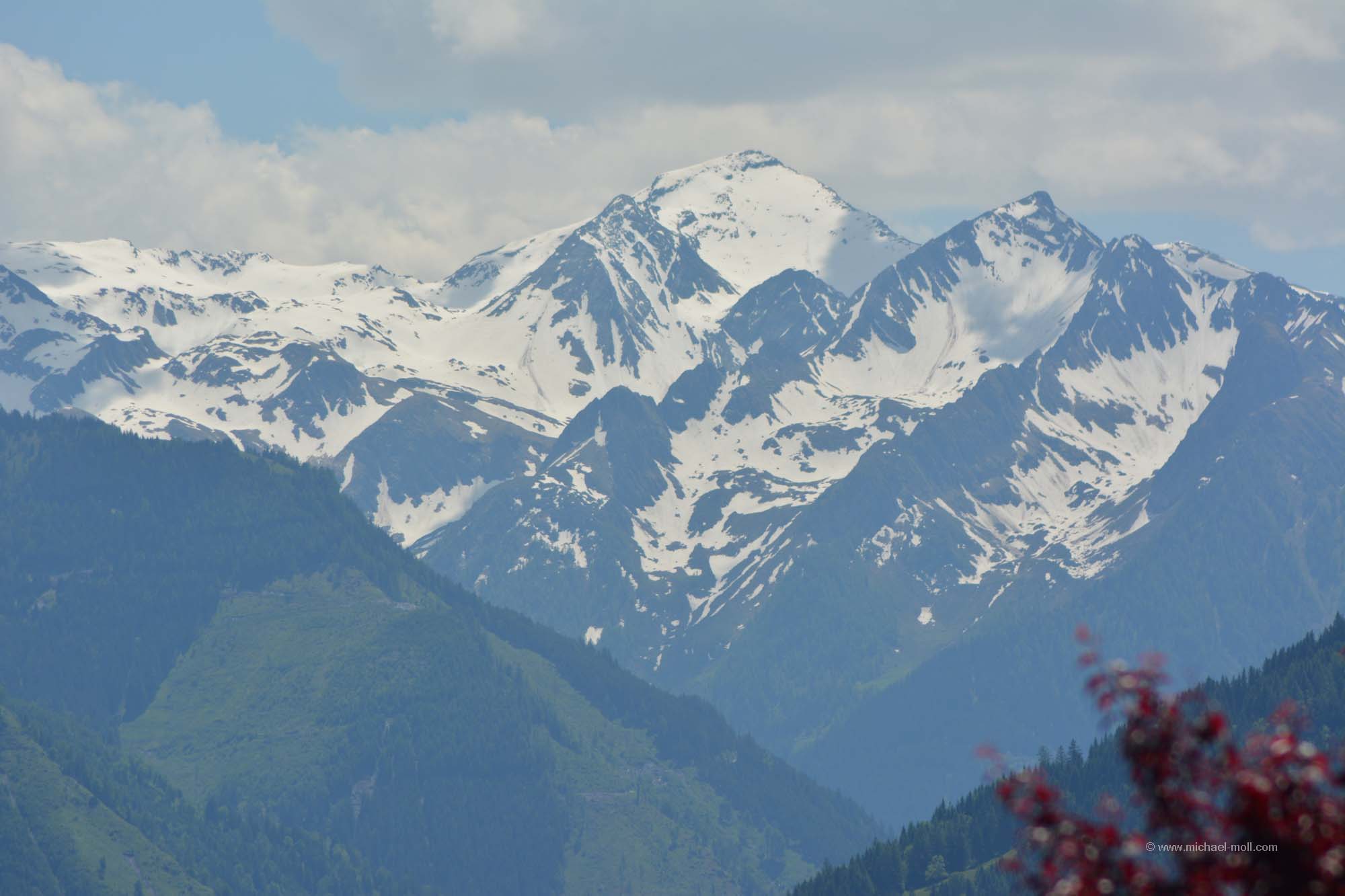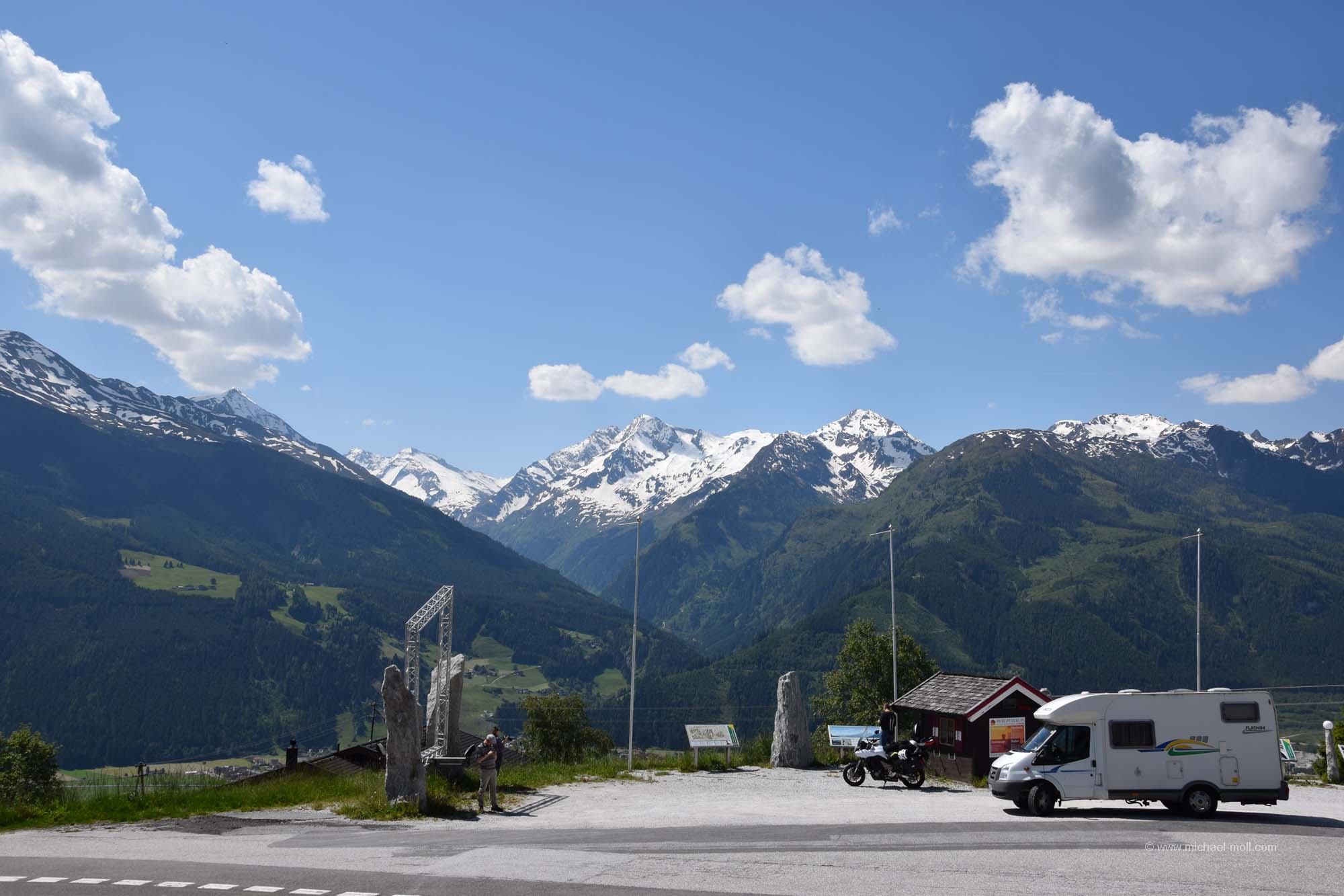 Unmittelbar darauf starteten wir unsere gemütliche Fahrt durch Tirol und das Salzburger Land. St. Johann in Tirol lockte auf einem touristischen Hinweisschild mit dem Attribut als barocke Gemeinde, was uns zu einem kurzen Zwischenstopp verlockte. Doch so groß ist St. Johann nicht und wir hatten noch einiges an dem Tag vor, also fuhren wir zügig weiter. Dabei ließen wir Kitzbühel rechts liegen. Kitzbühel ist zwar namentlich sehr bekannt, aber doch eher wegen des Wintersports. Bei fast 30 Grad bereits am Vormittag war an Wintersport aber überhaupt nicht zu denken. Südlich von Kitzbühel folgte der gerade einmal 1.274 Meter hohe Pass Thurn, der keine Herausforderung stellt. Doch auf der Südseite gibt es ein paar schöne Aussichtspunkte, wo man den Blick auf die Hohen Tauern und auf den Großvenediger genießen kann.