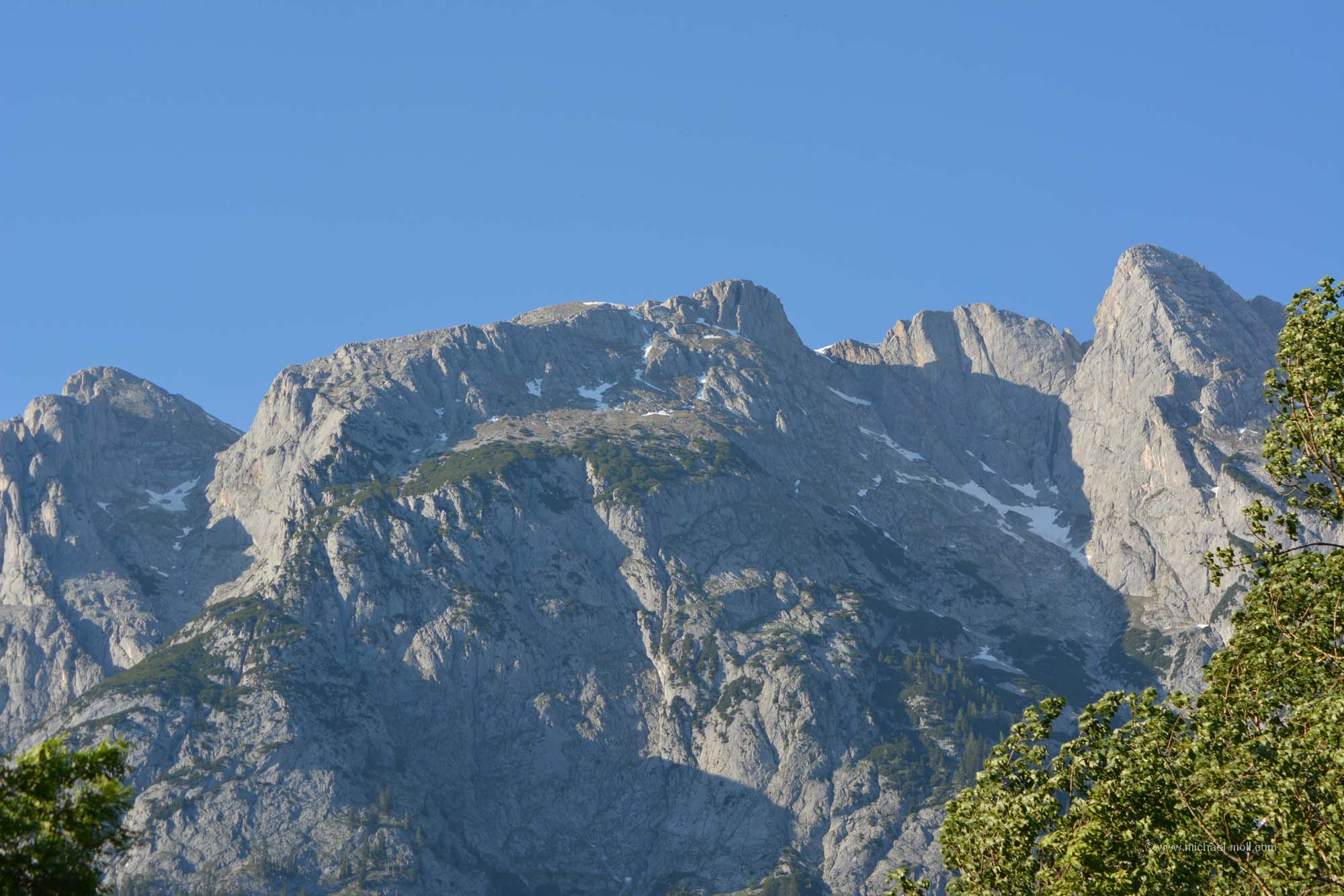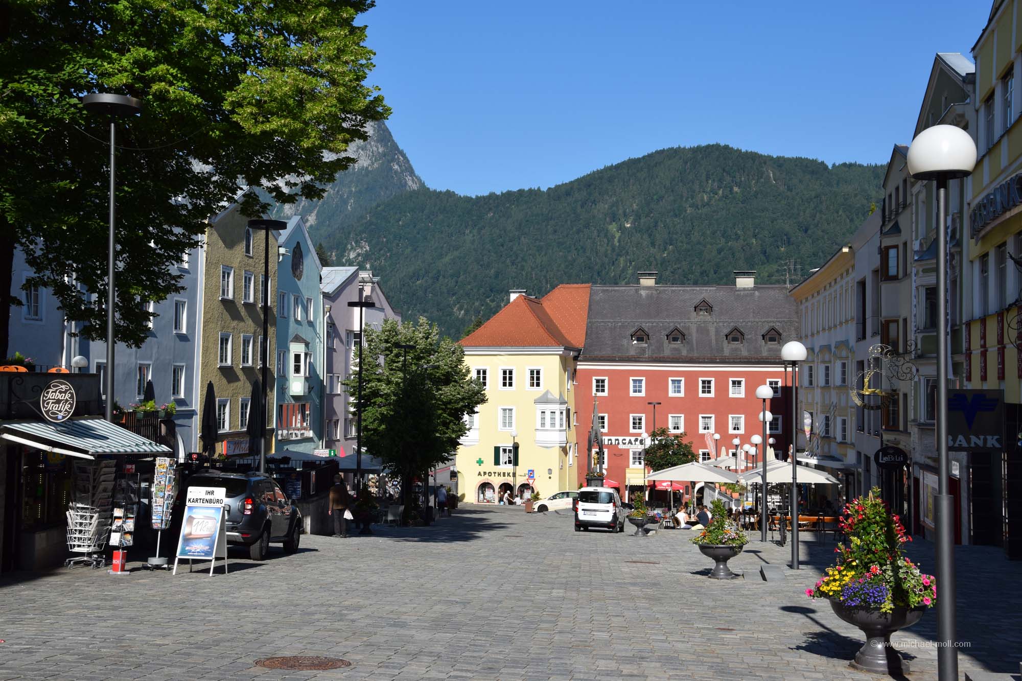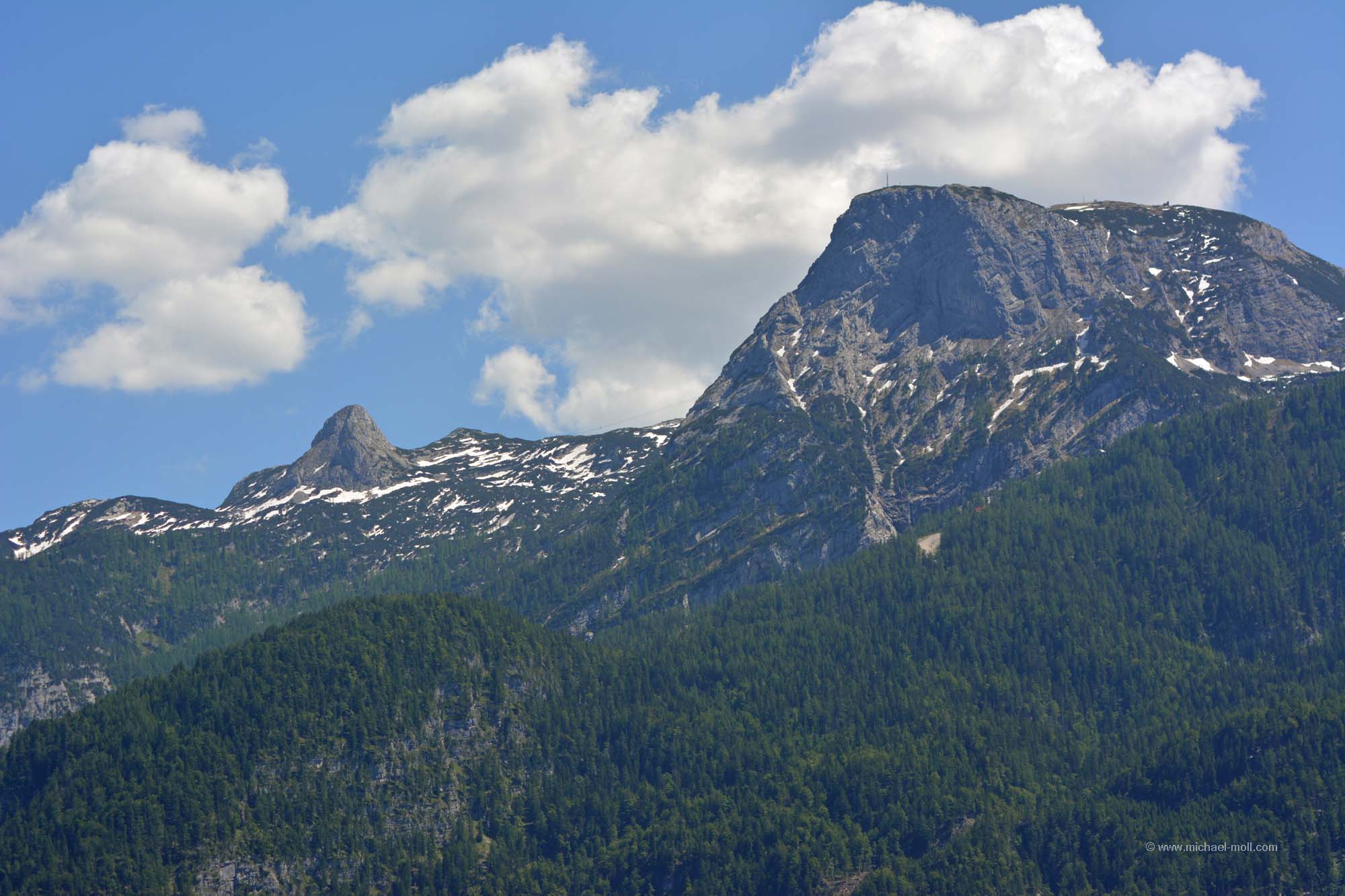 Unmittelbar darauf starteten wir unsere gemütliche Fahrt durch Tirol und das Salzburger Land. St. Johann in Tirol lockte auf einem touristischen Hinweisschild mit dem Attribut als barocke Gemeinde, was uns zu einem kurzen Zwischenstopp verlockte. Doch so groß ist St. Johann nicht und wir hatten noch einiges an dem Tag vor, also fuhren wir zügig weiter. Dabei ließen wir Kitzbühel rechts liegen. Kitzbühel ist zwar namentlich sehr bekannt, aber doch eher wegen des Wintersports. Bei fast 30 Grad bereits am Vormittag war an Wintersport aber überhaupt nicht zu denken. Südlich von Kitzbühel folgte der gerade einmal 1.274 Meter hohe Pass Thurn, der keine Herausforderung stellt. Doch auf der Südseite gibt es ein paar schöne Aussichtspunkte, wo man den Blick auf die Hohen Tauern und auf den Großvenediger genießen kann.